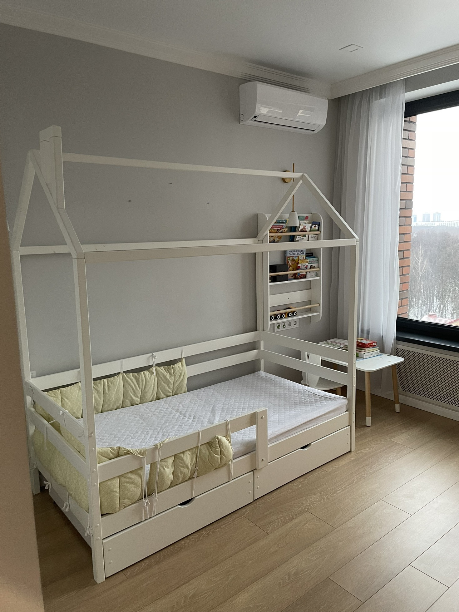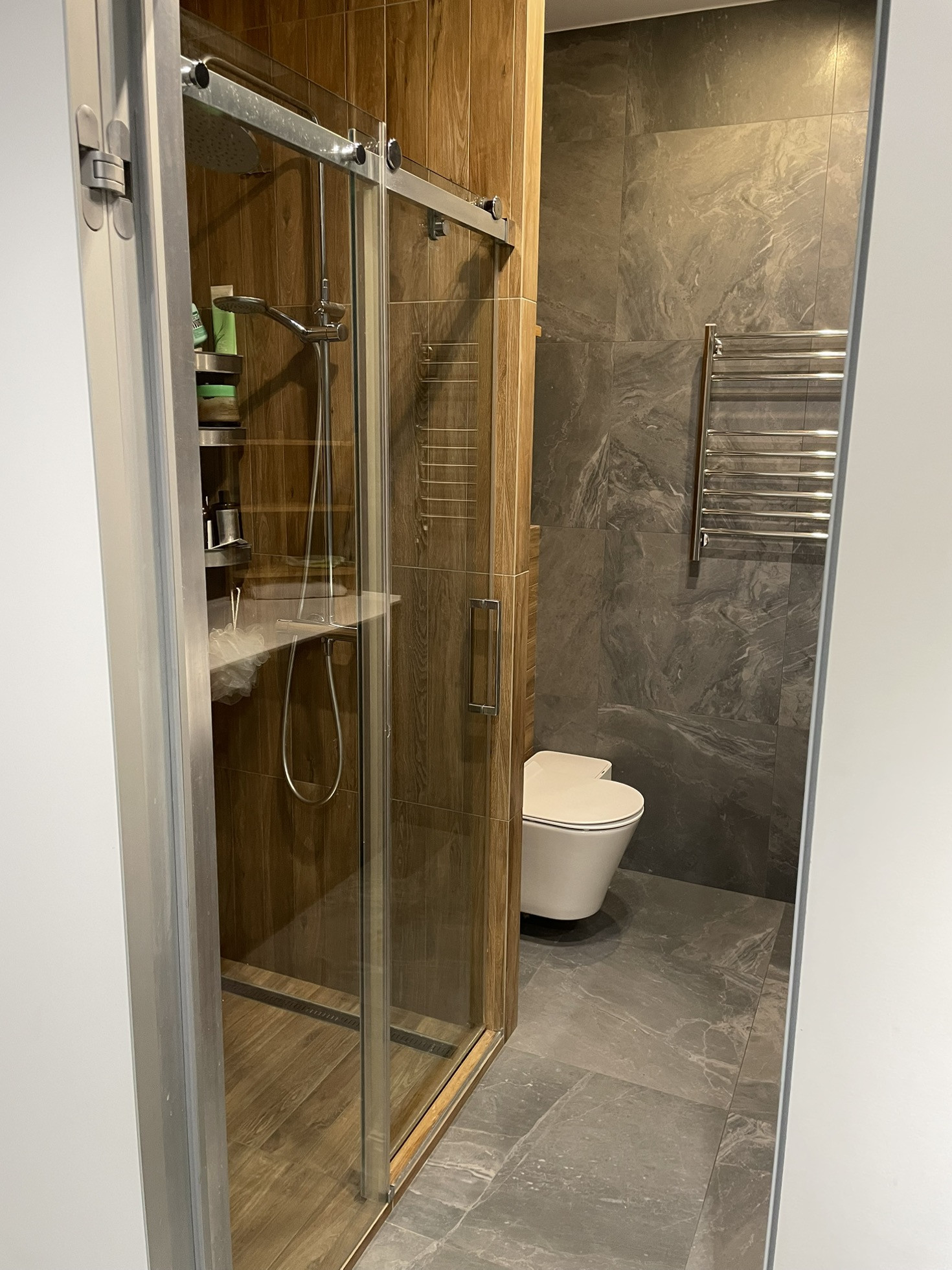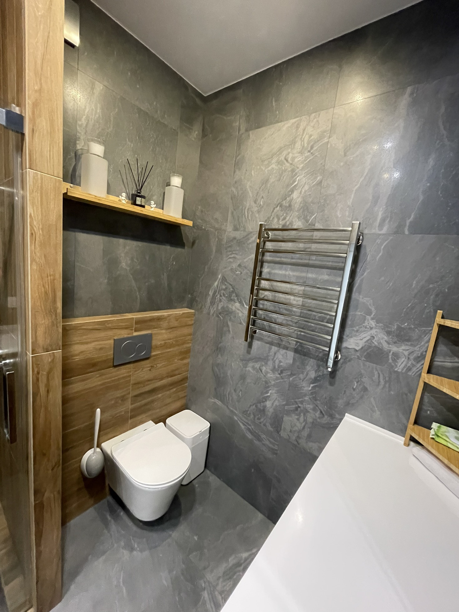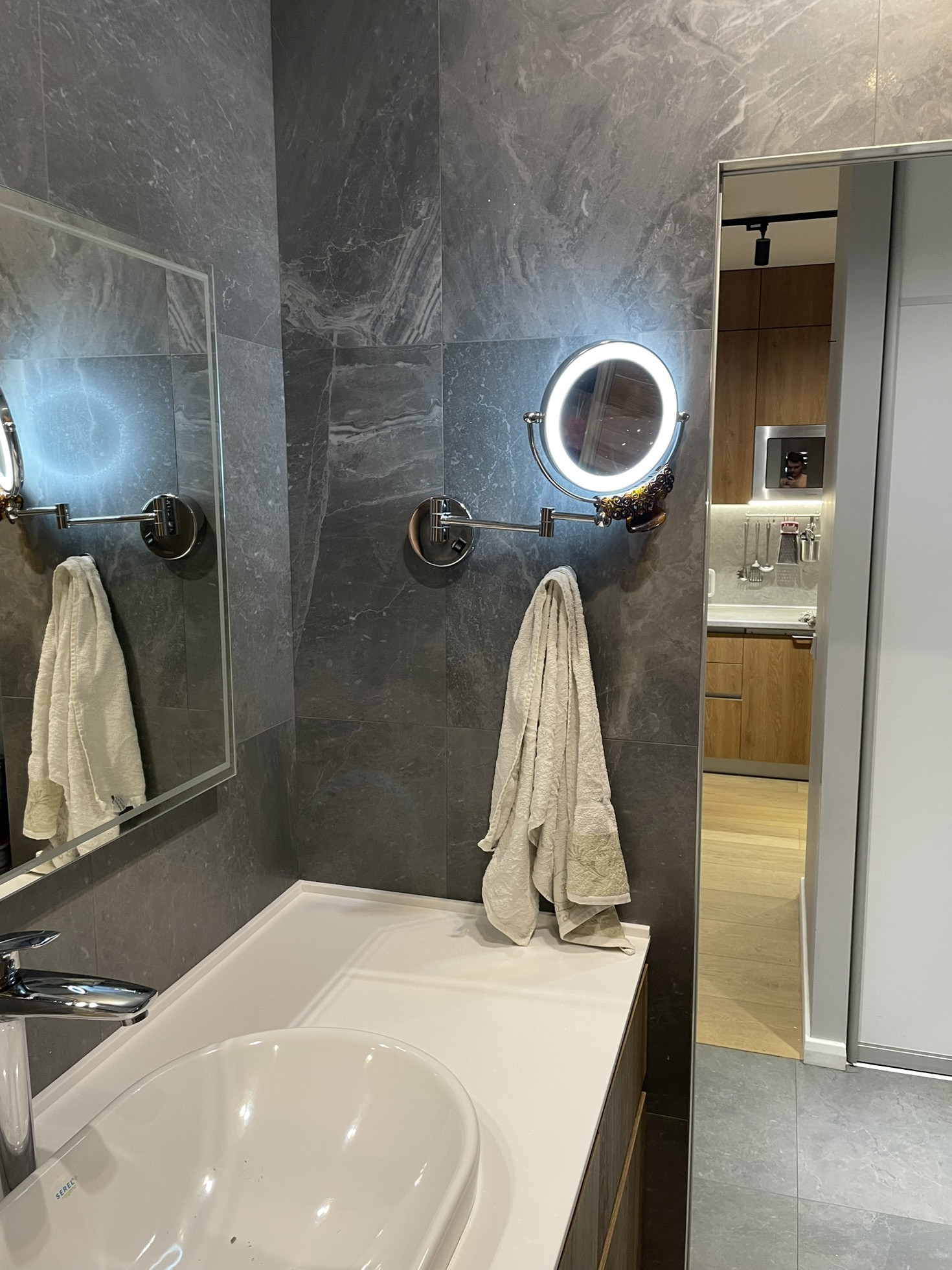 Установлена мультисплит система кондиционирования, кондиционер в каждой комнате с отдельным пультом. Ванная реализовывалась как в отеле, встроенная стиральная машина с сушкой (сушит хорошо), корзина для белья, отдельная бутылочница под химию и несколько ящиков. Большущая душевая с термостатом (112х90). В квартире очень много места для хранения: шкаф в спальне, шкаф в коридоре с отдельным пространством для обуви, высокие шкафы в кухне (под потолок).