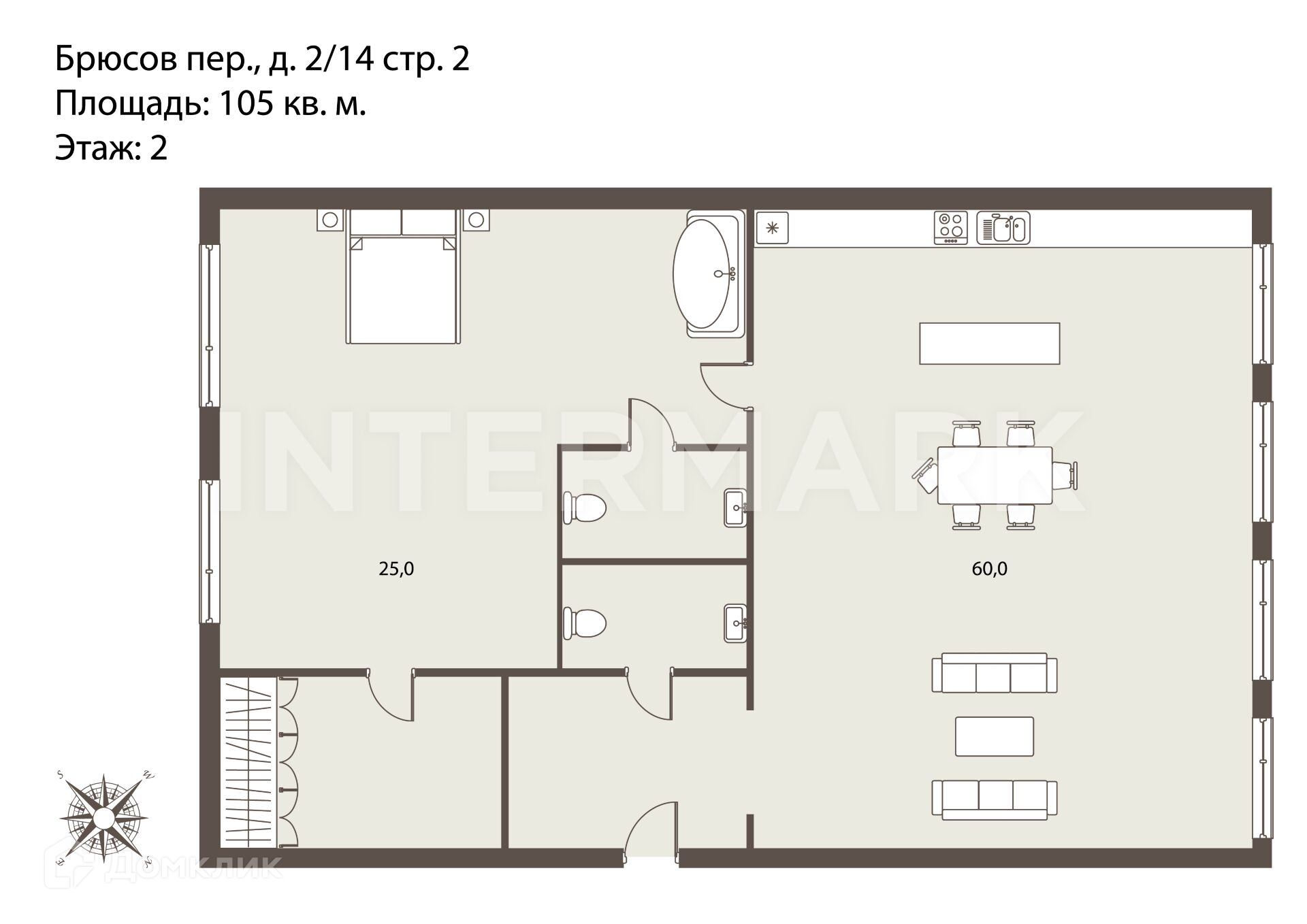 2-комнатная квартира, 105 м2, этаж 1 / 6, на продажу в Москве, Брюсов переулок, 2/14с2