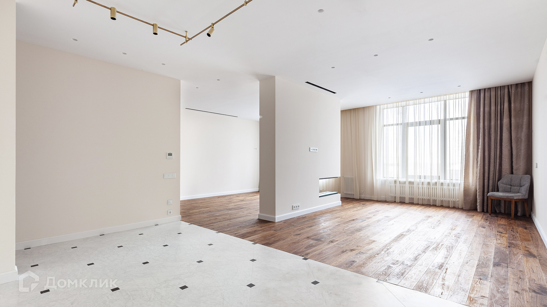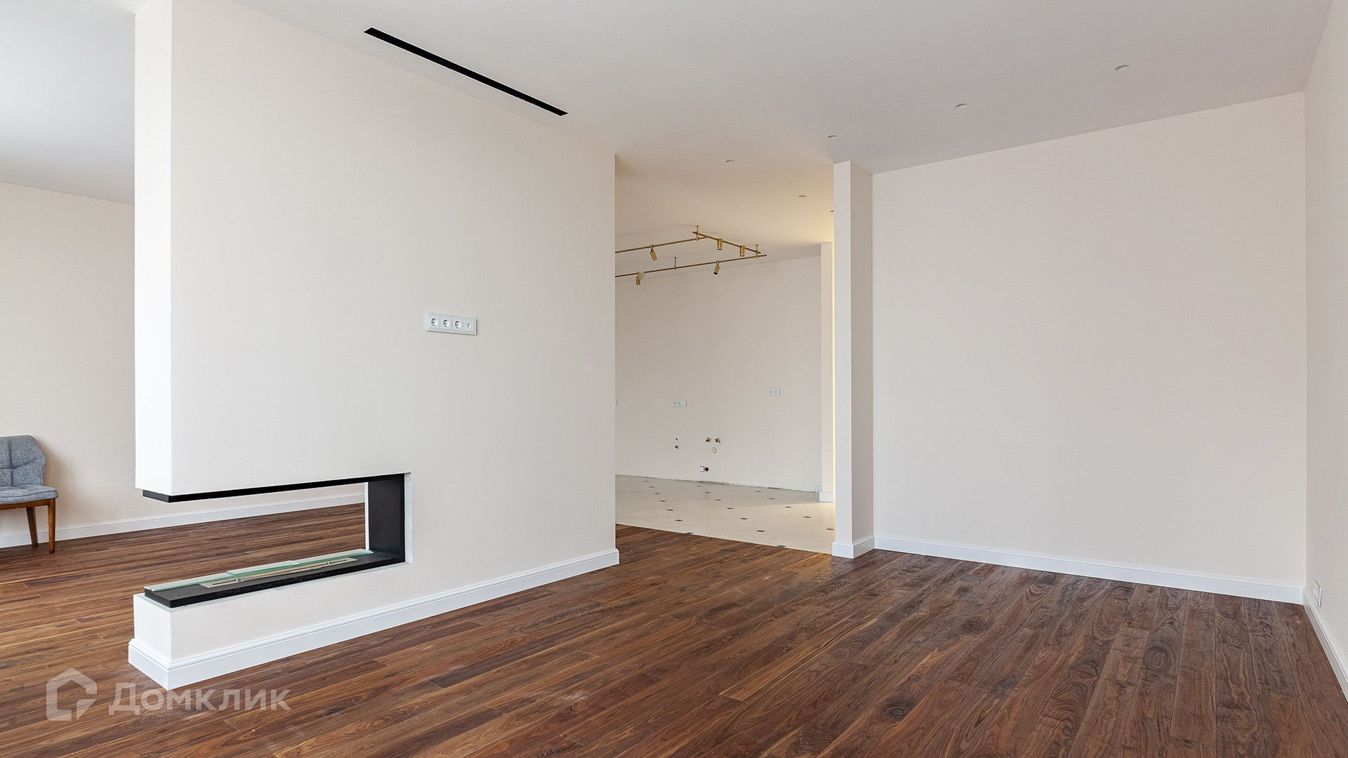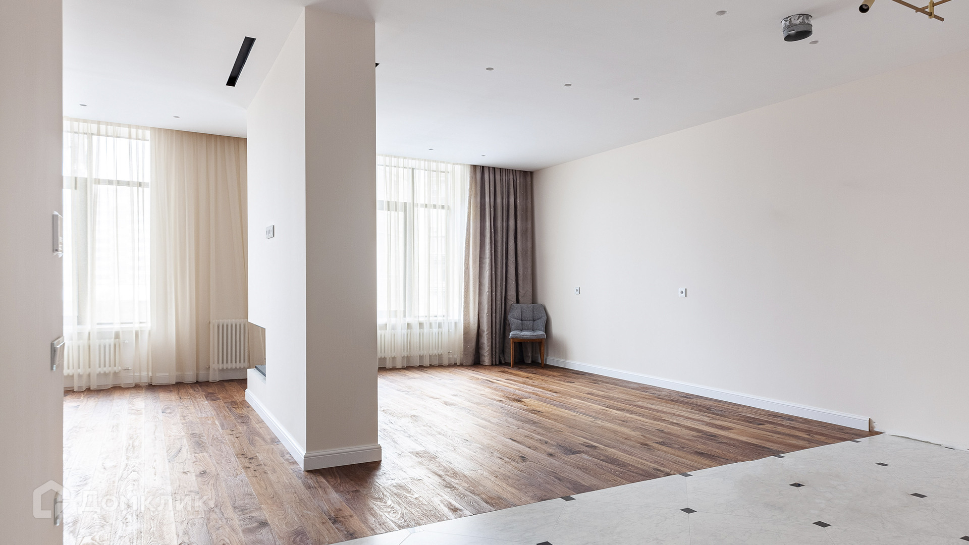 Планировка: кухня-гостиная с биокамином, 2 мастер-спальни со своими гардеробными и ванными комнатами, гостевой санузел. Благодаря высоким потолкам и большим окнам пространство наполнено светом. Окна выходят на 2 стороны — на улицу и в благоустроенный двор.