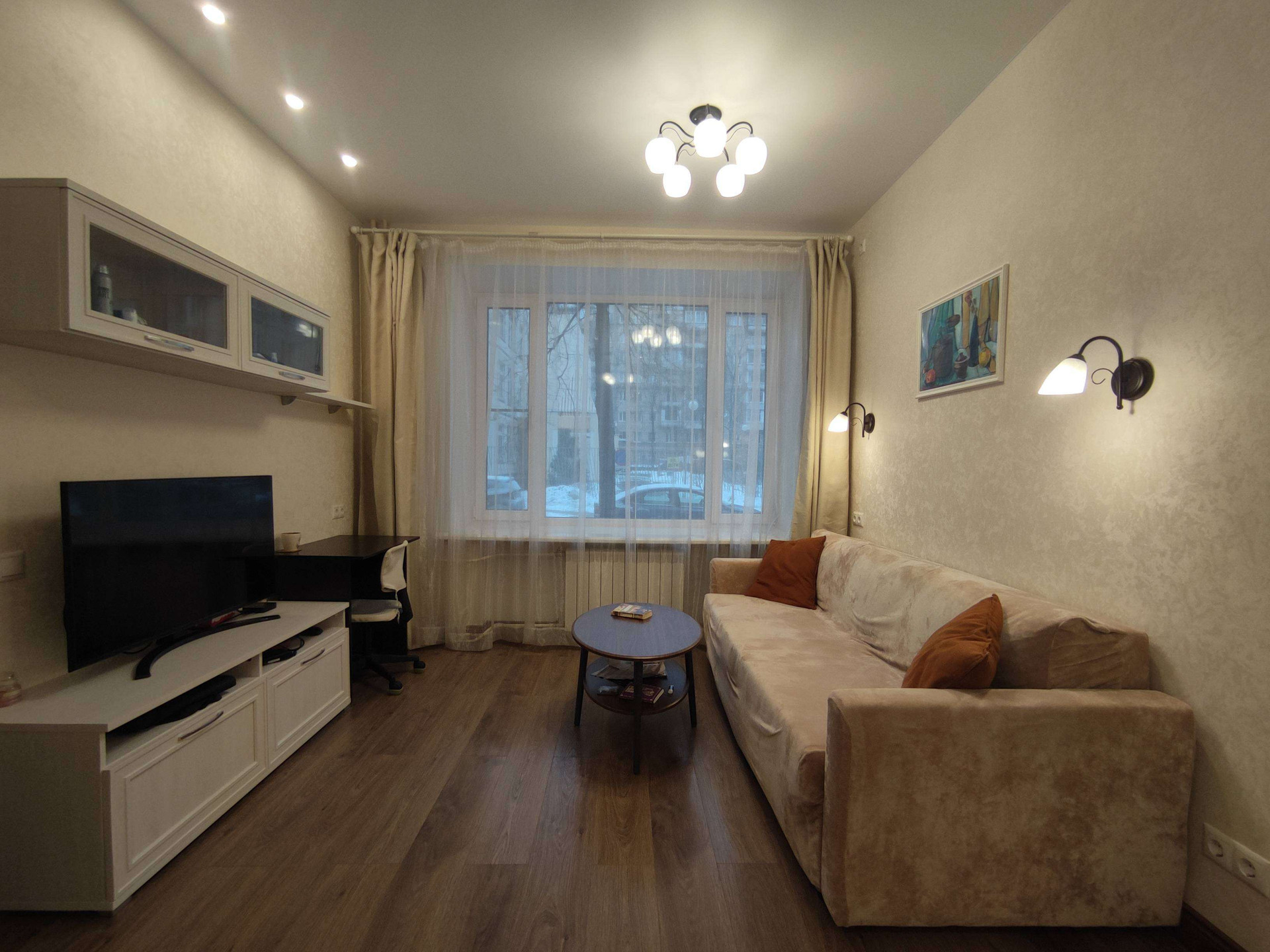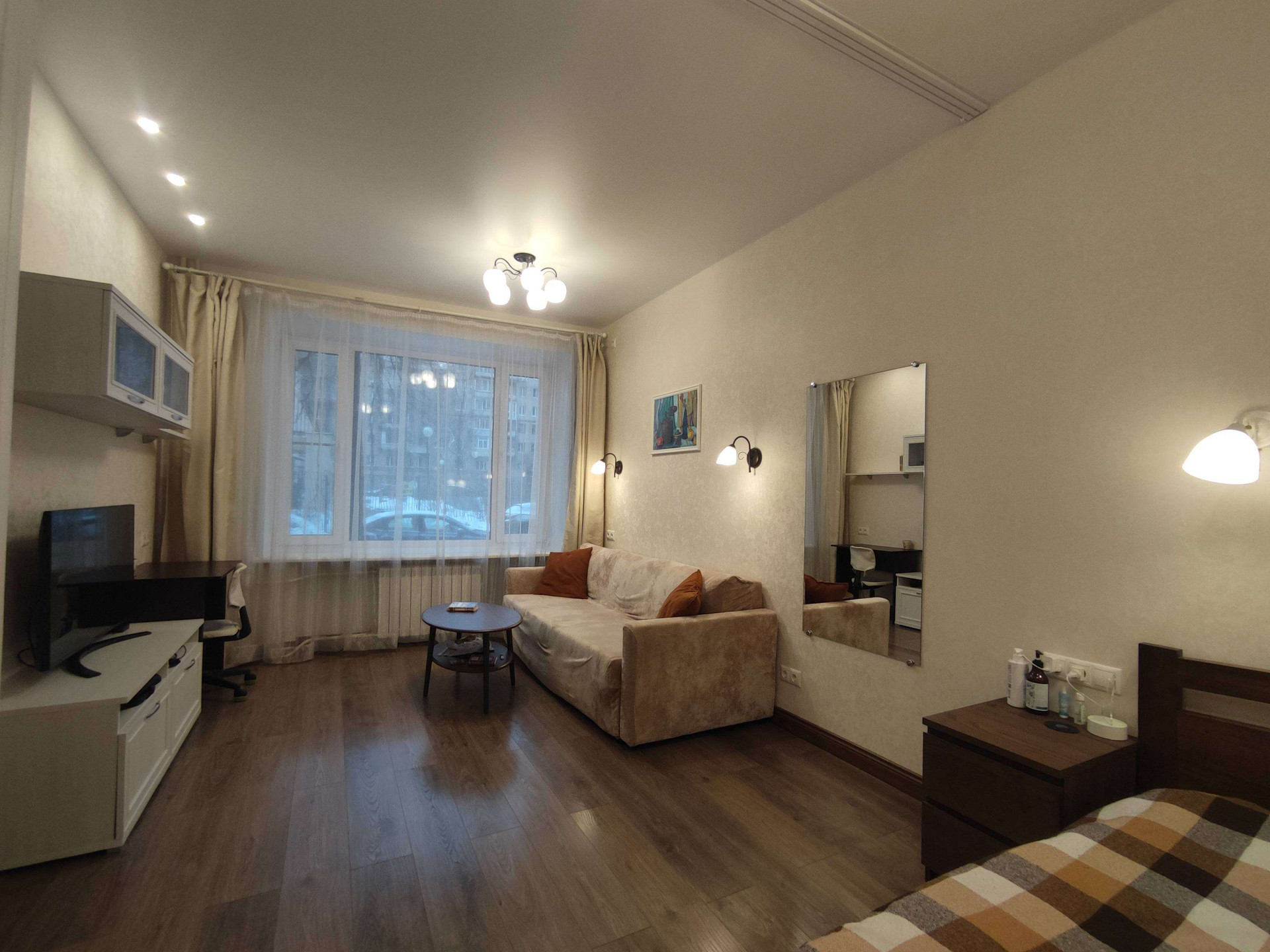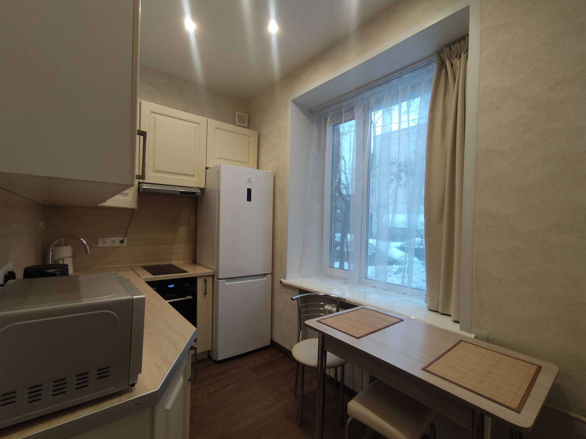 Уютное дизайнерское оформление в бежево-коричневых тонах, стиль классический, потолки 2,98 (на остальных этажах 2,74), нестандартно большие окна (230х170 в комнате, 155х170 в кухне). Стекла в окнах противоударные (триплекс).