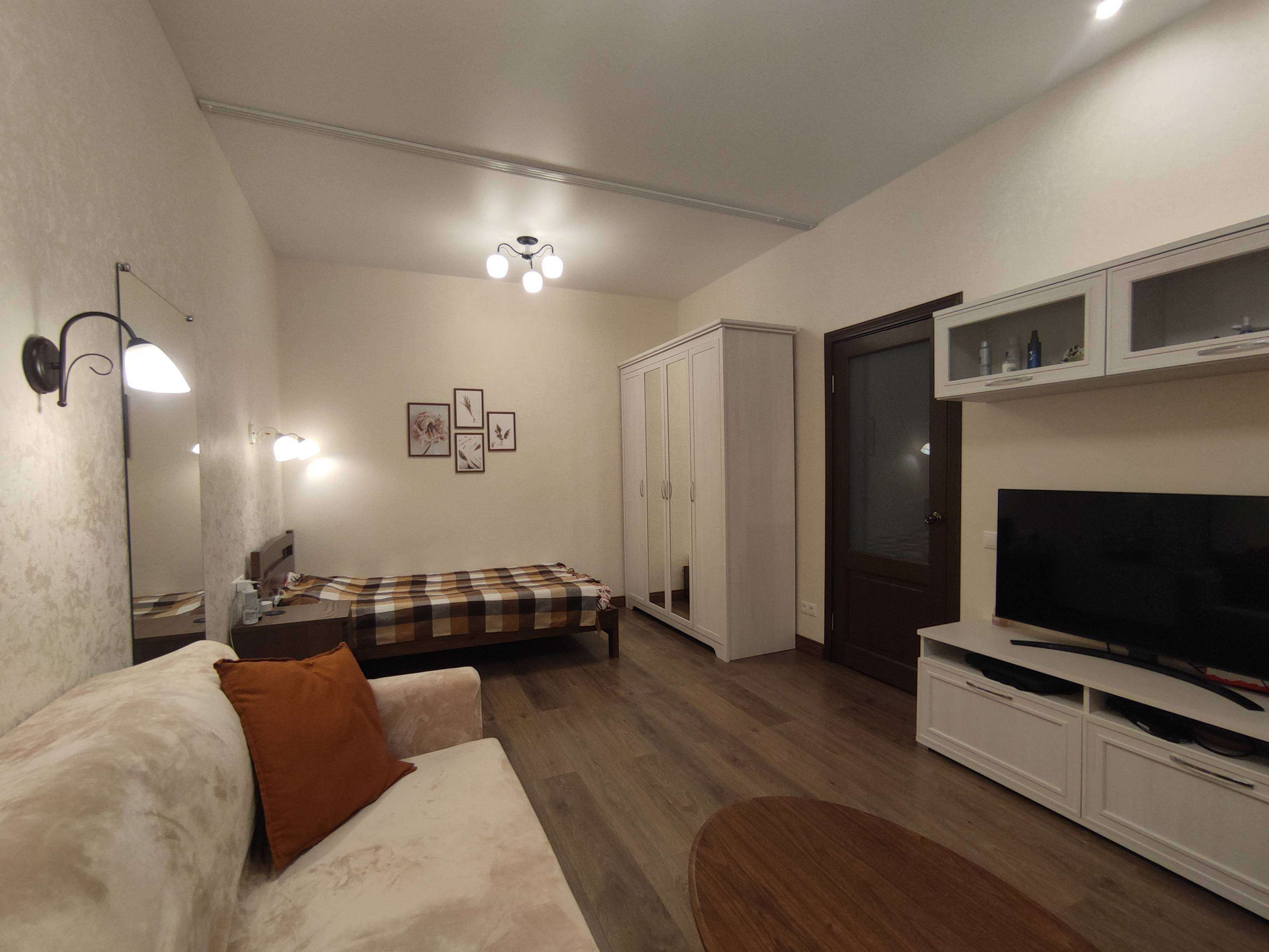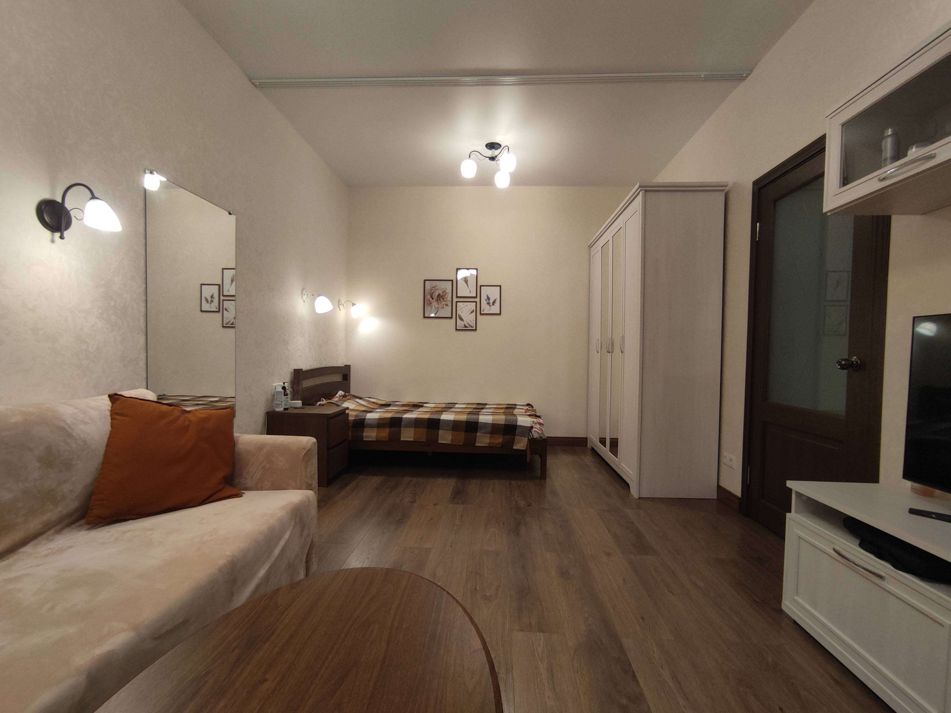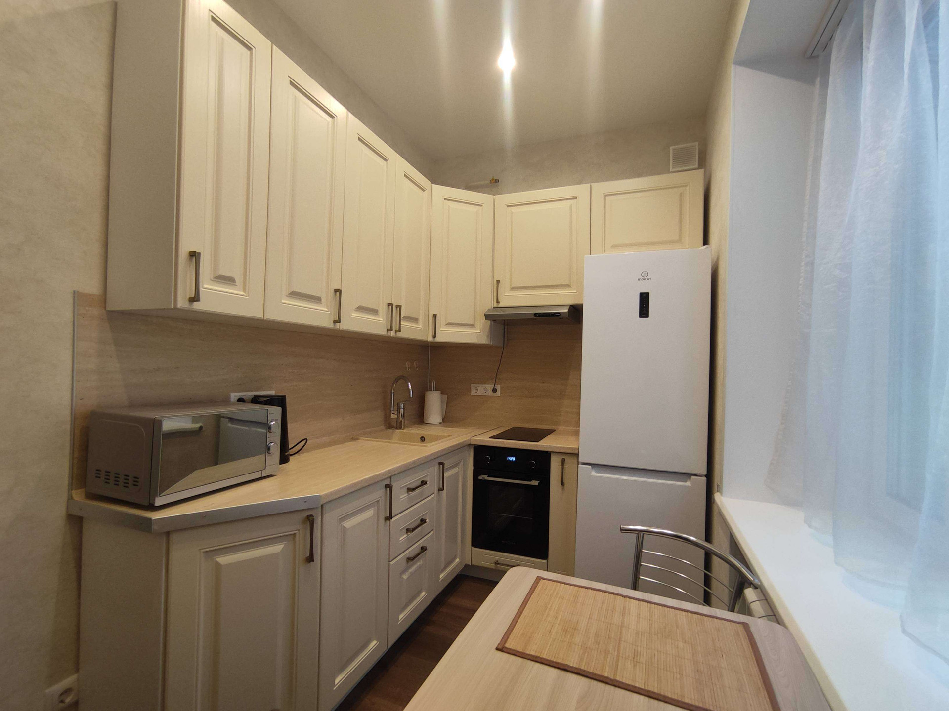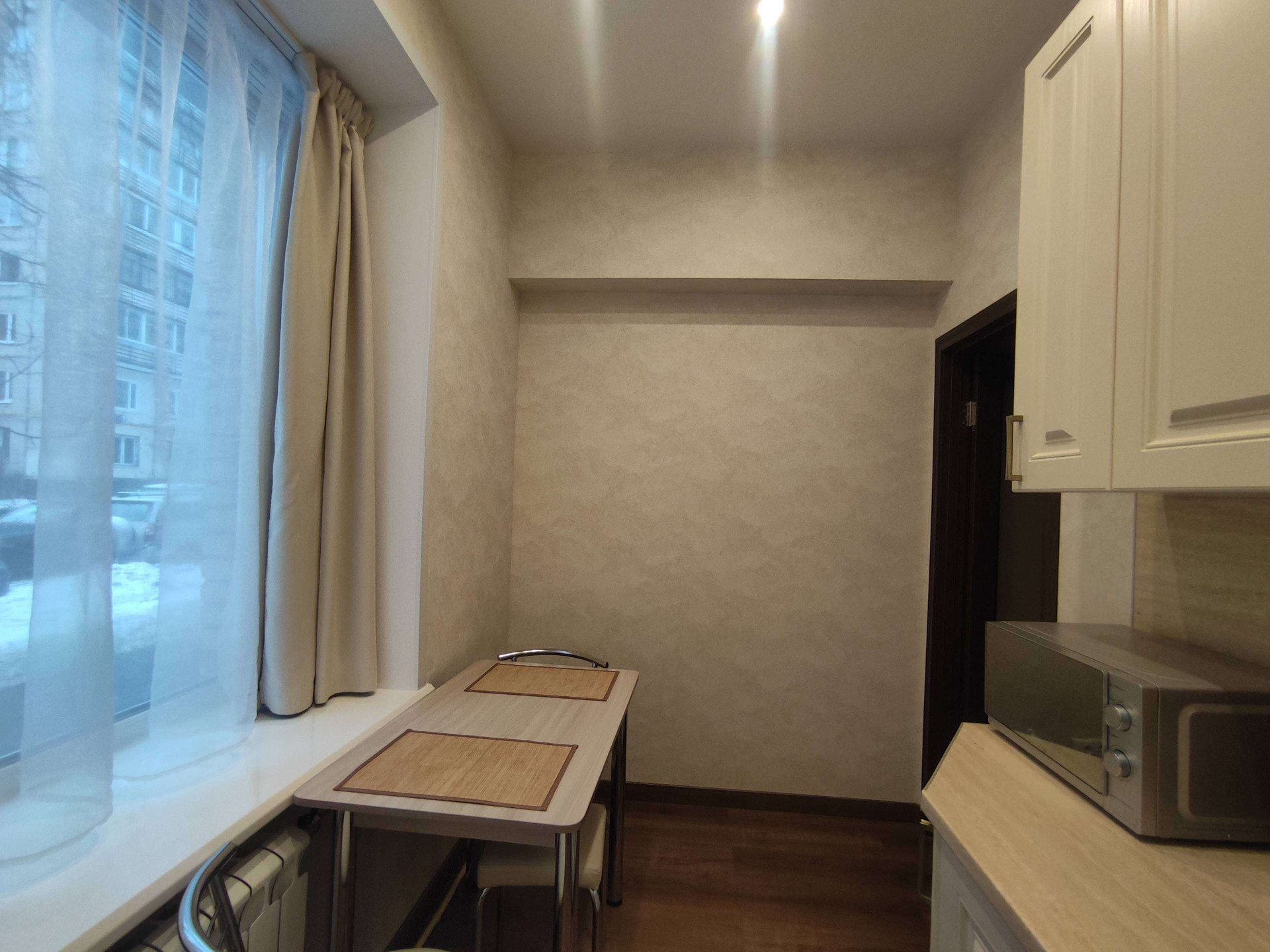 Уютное дизайнерское оформление в бежево-коричневых тонах, стиль классический, потолки 2,98 (на остальных этажах 2,74), нестандартно большие окна (230х170 в комнате, 155х170 в кухне). Стекла в окнах противоударные (триплекс).