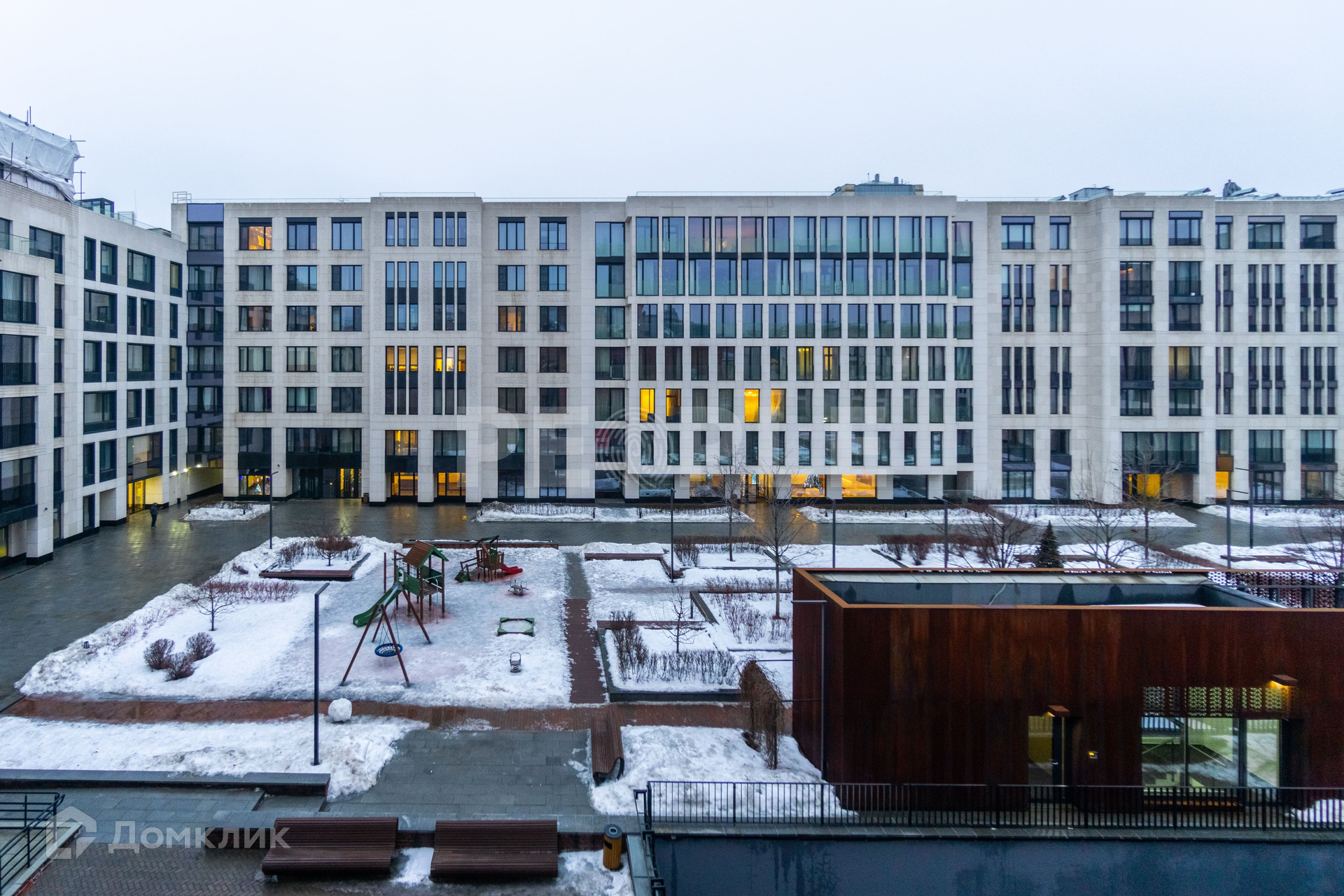 Зеленый внутренний двор оснащен прогулочными дорожками, детскими и спортивными площадками, зоной отдыха.