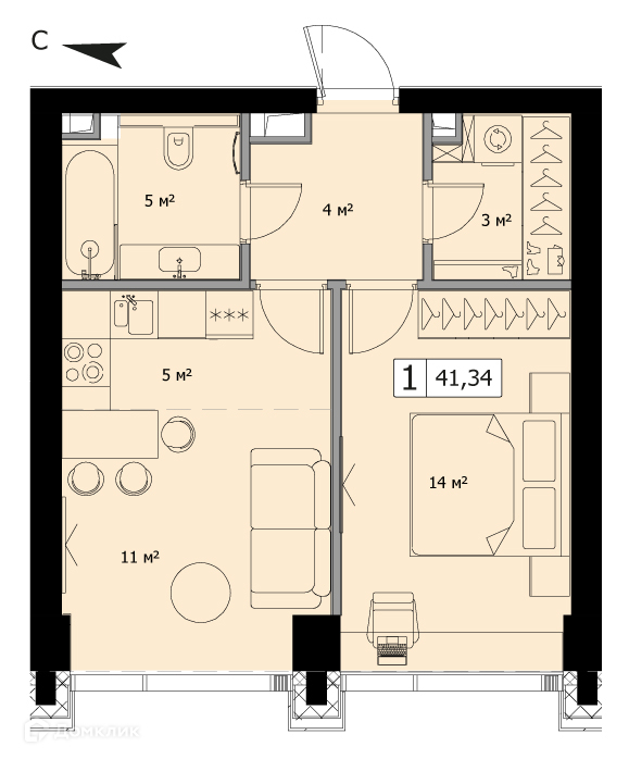 Общая площадь 41.34 м2
