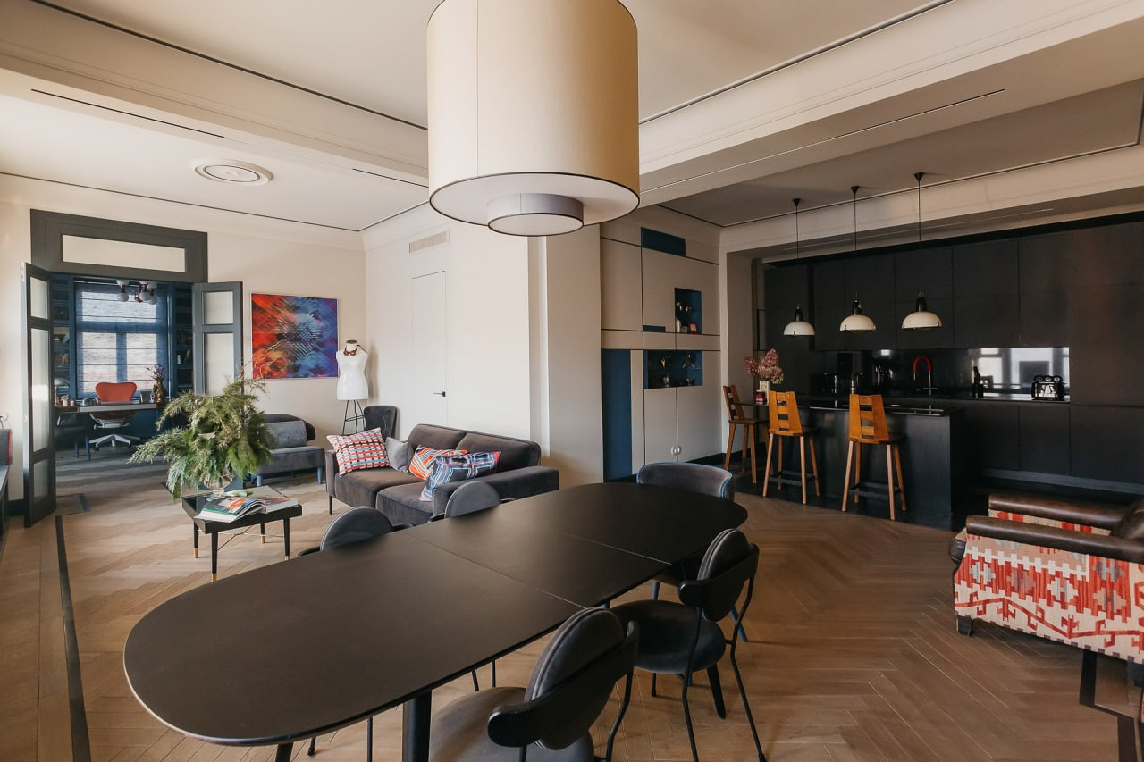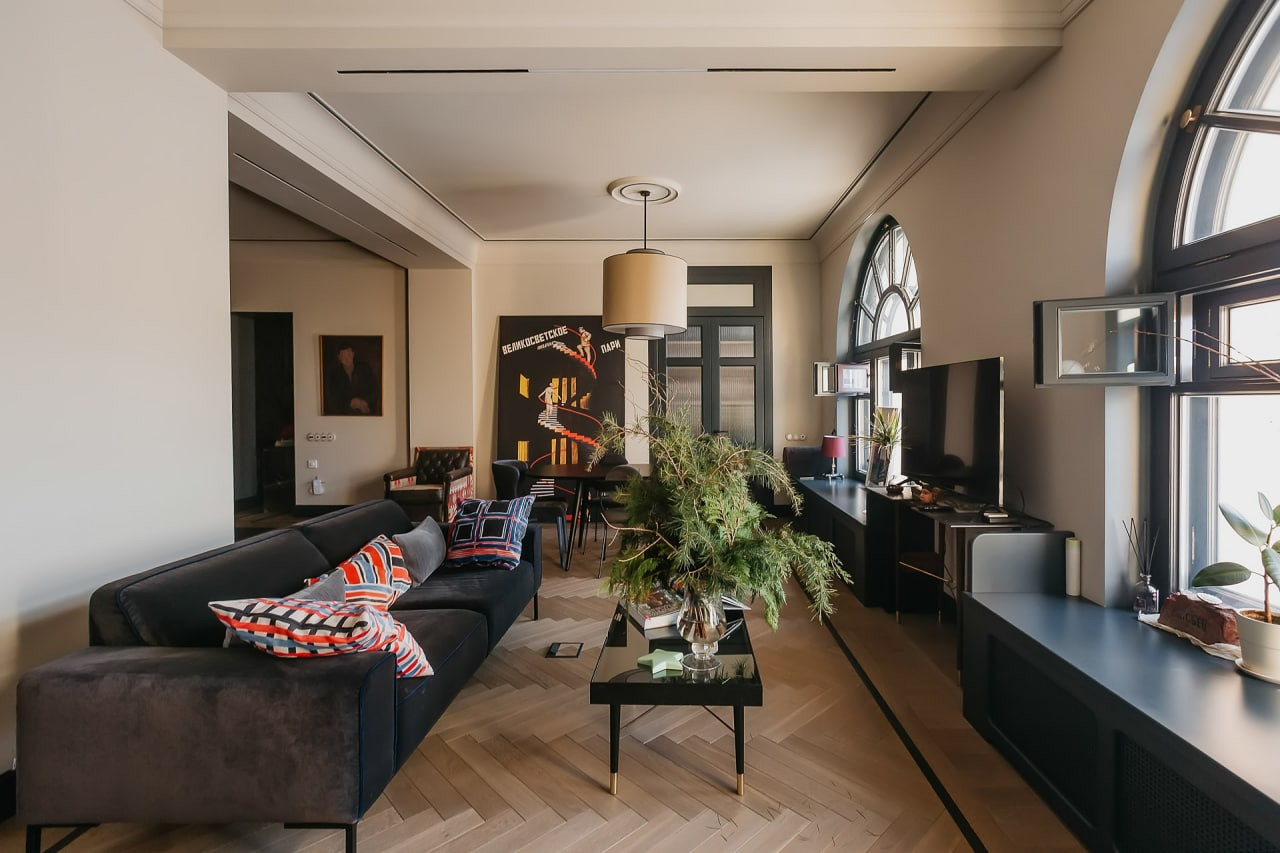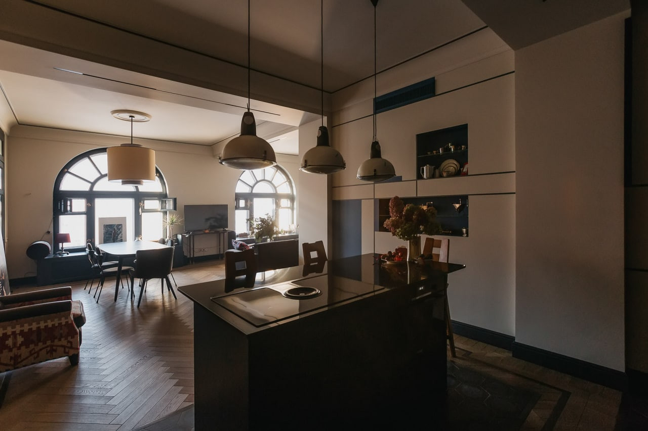 О КВАРТИРЕ: Функциональная и разумная планировка. Гостиная-столовая объединена с кухней, спальня со своим санузлом, кабинет, гардеробная, гостевой санузел, кладовая-постирочная с дополнительной хозяйственной раковиной. Высота потолков 3,2 м. Свежий эксклюзивный авторский ремонт в стиле авангарда 20-х годов прошлого века. Дизайн квартиры был удостоен внимания множества престижных архитектурных изданий (AD, Design mate ипр), квартира была признана одной из 100 лучших дизайнерских квартир мира и опубликована в юбилейном выпуске издания Andrew Martin. Все отделочные материалы премиум класса, натуральный деревянный пол с экологическим покрытием и натуральный каменный пол с подогревом, встроенная мебель, мягкая мебель, обои, межкомнатные двери и оконные рамы - все выполнено по индивидуальному заказу из экологических материалов, с сохранением исторических эскизов и форм эпохи. Элитная сантехника, полностью оборудованная премиальной техникой кухня: электрическая индукционная плита со встроенной вытяжкой, посудомоечная машина, духовой шкаф, холодильник и пр. В квартире сделана эксклюзивная шумоизоляция по всему периметру, полностью заменены электропроводка и система водоснабжения, установлена система очистки воздуха и сплит-ситема, общая система очистки воды и дополнительная система очистки питьевой воды, аква-стоп. Разумно спроектированы вместительные системы хранения – гардеробная с полками-антресолями, шкафы в спальне с внутренней подсветкой, стенной шкаф в коридоре, кладовая–постирочная, встроенные шкафы в санузлах. Все перепланировки оформлены.