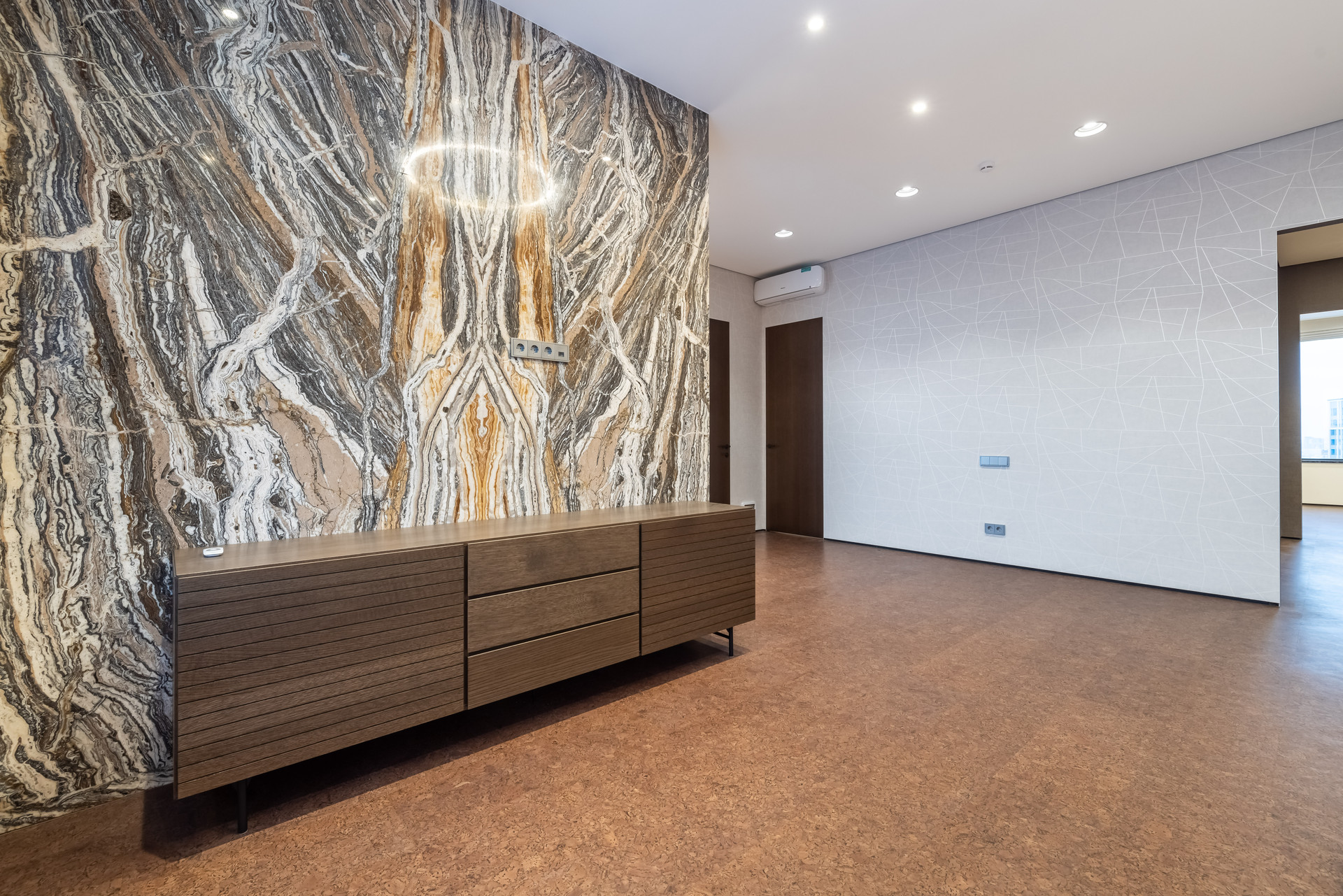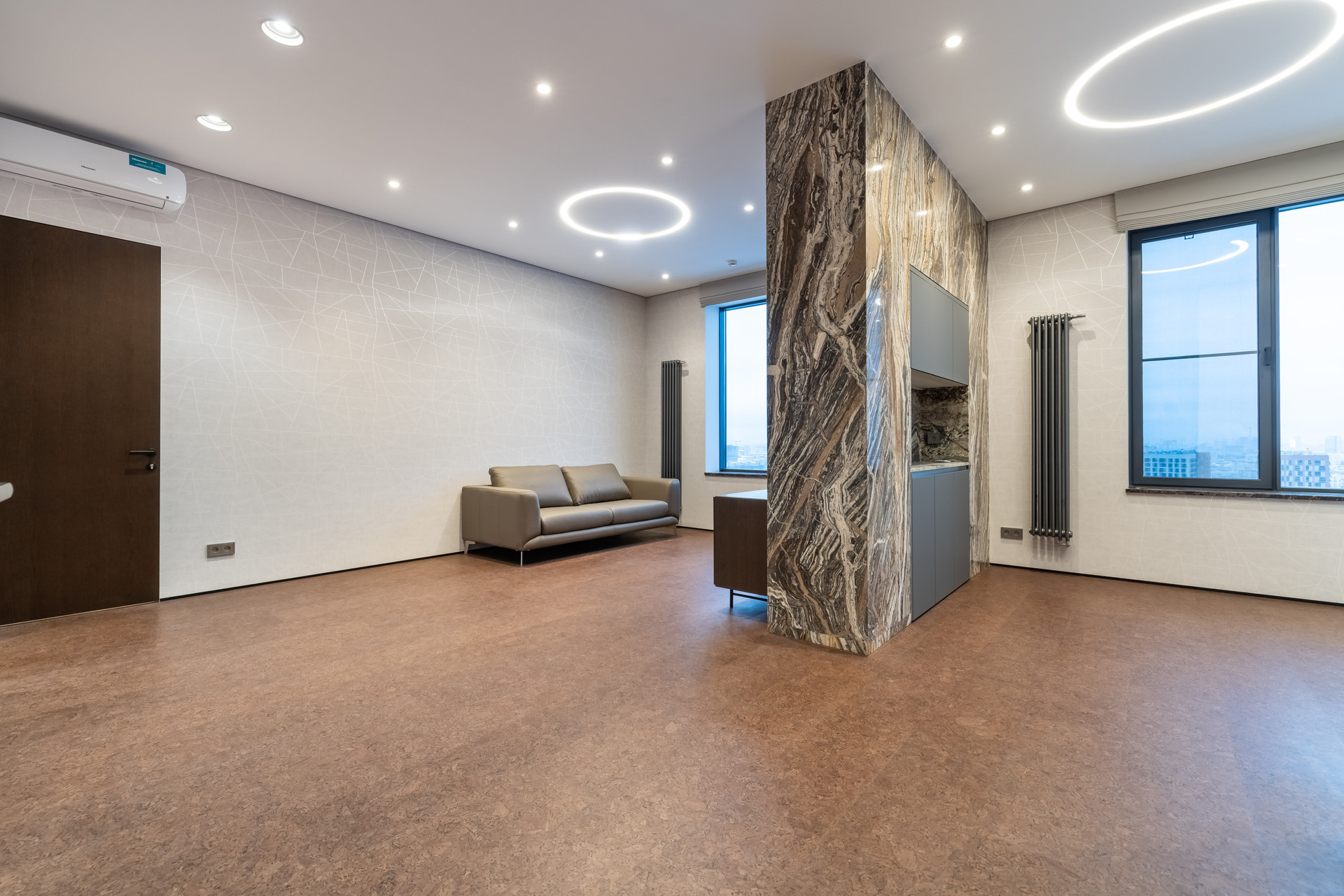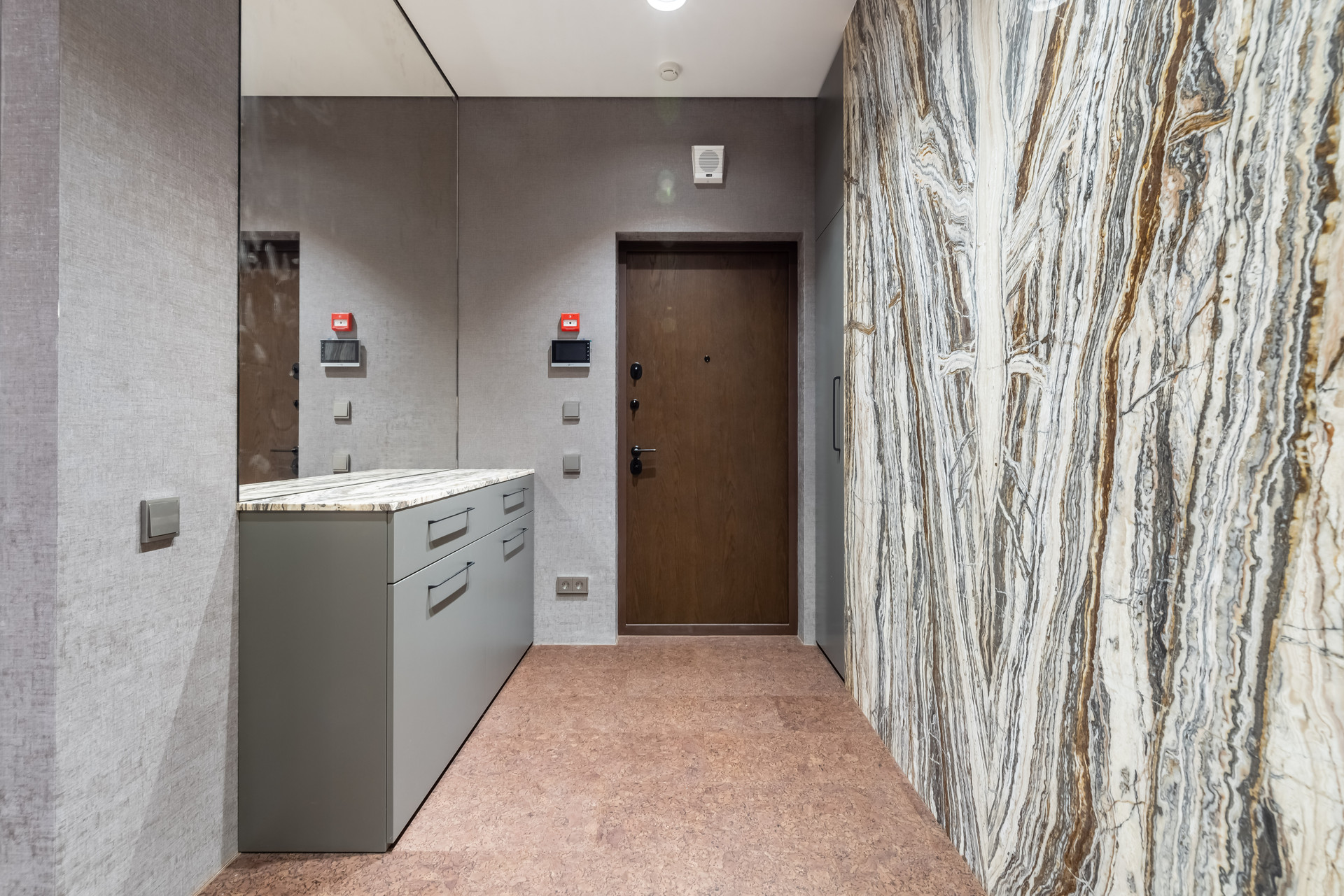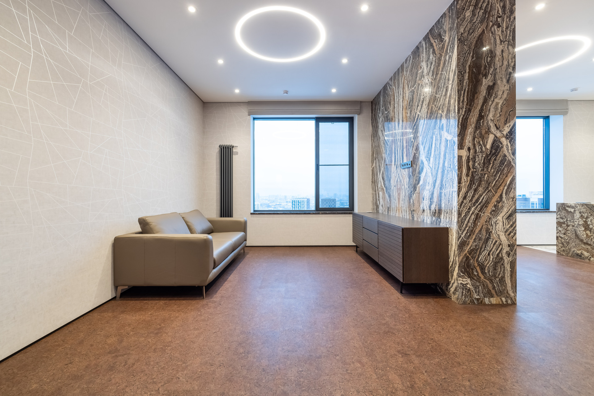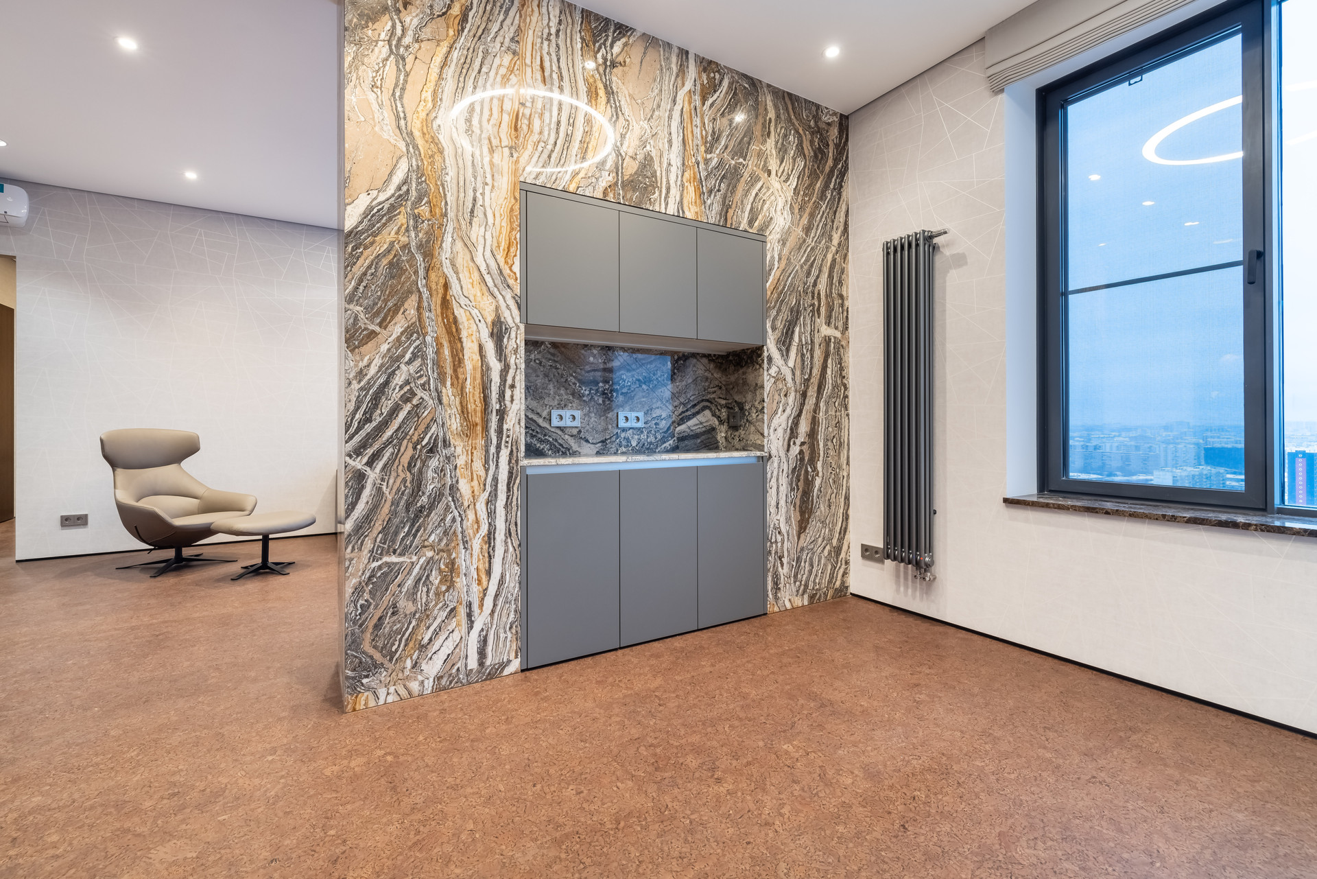 На полу экологичное пробковое покрытие Granorte (Испания), в санузлах керамическая плитка Rex (Италия).