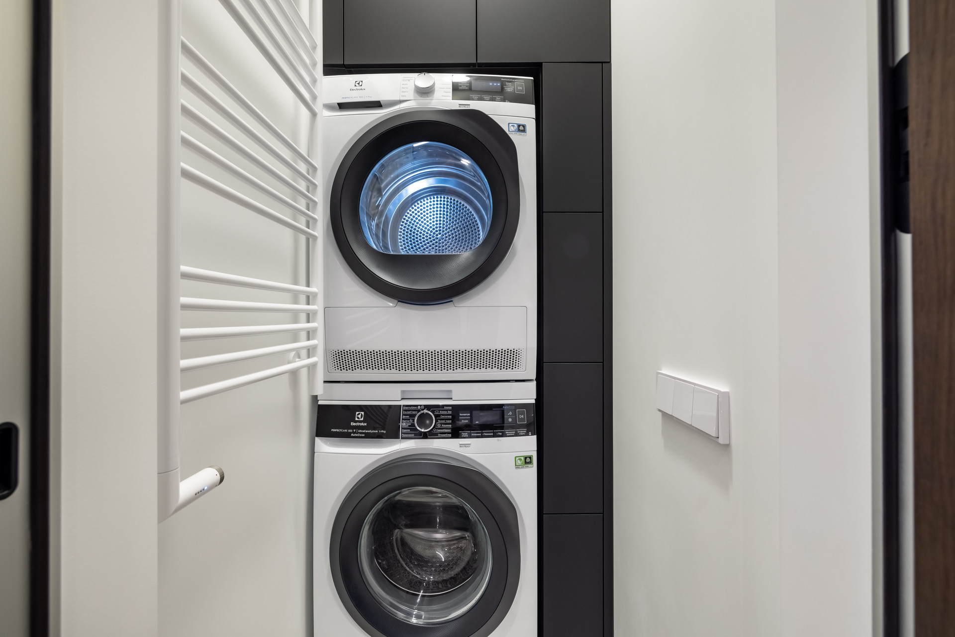 На кухне топовые модели бытовой техники фирм Bosch (варочная поверхность, духовка, встроенная свч, посудомоечная машина) и Liebherr (холодильник и отдельная морозильная камера). Островная вытяжке Smeg из нержавеющей стали. Стиральная и сушильная машина Electrolux.