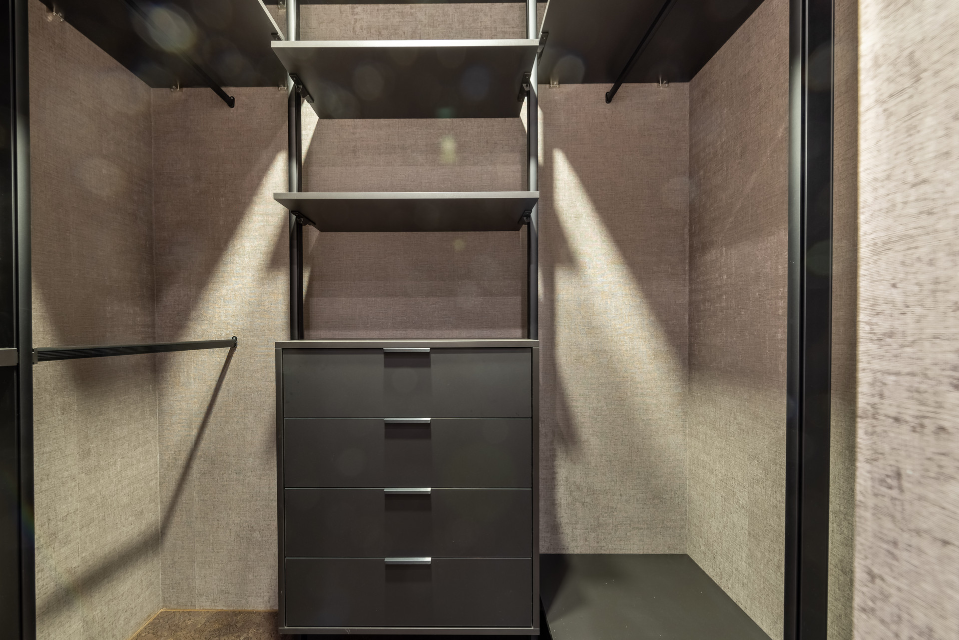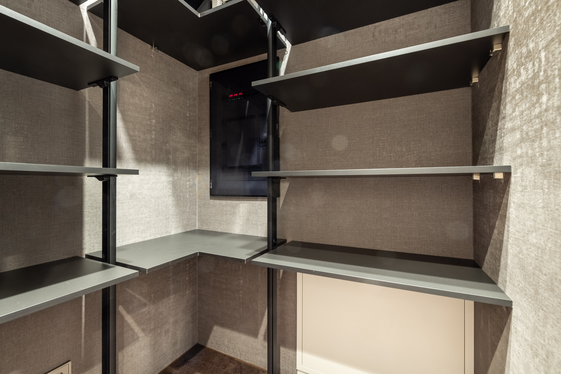 Потолочный и напольный теневой плинтус, на стенах итальянские обои. Встроенный светодиодный свет, розетки и выключатели Schneider. Установлен домофон, соединенный с камерами у подъездов.
