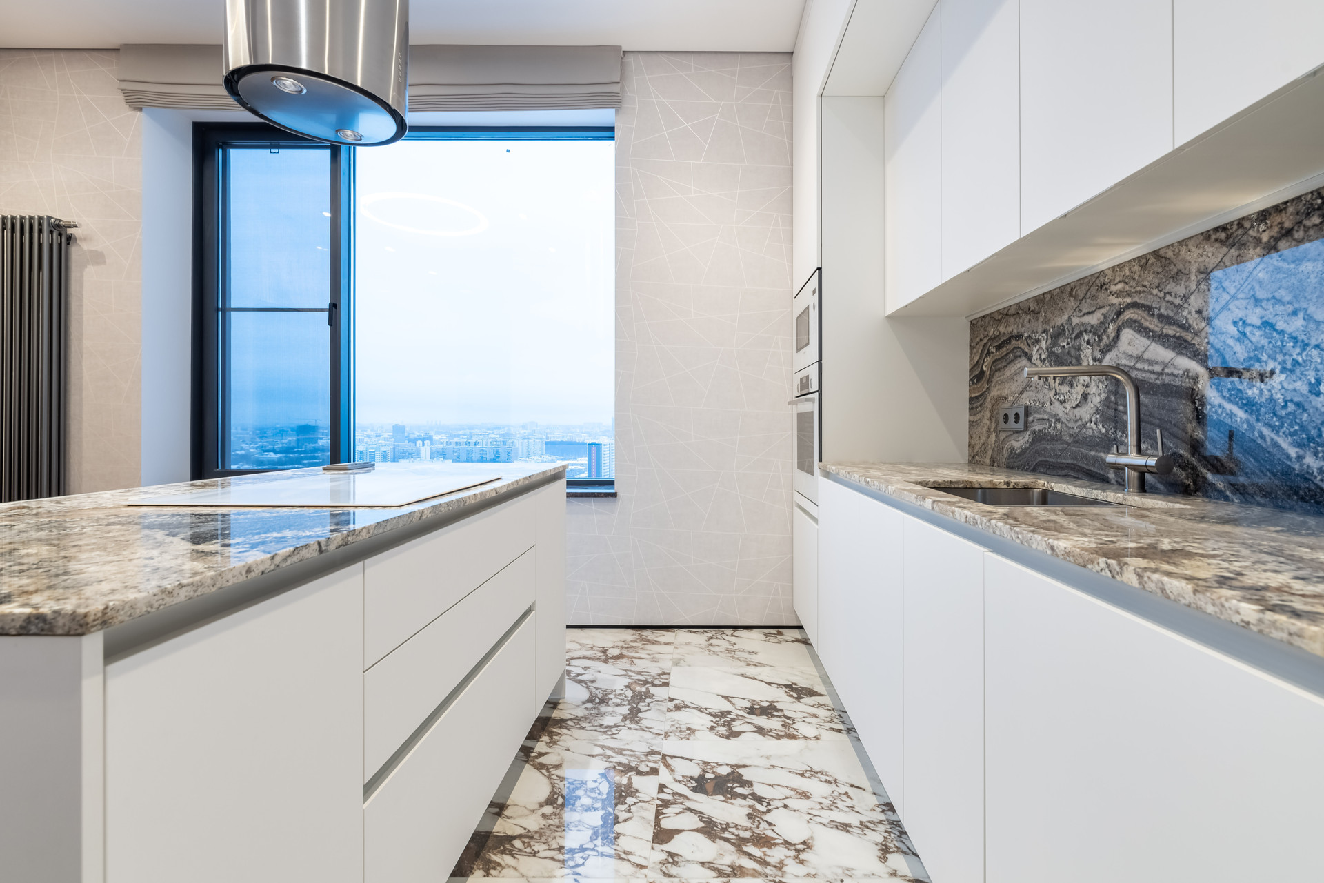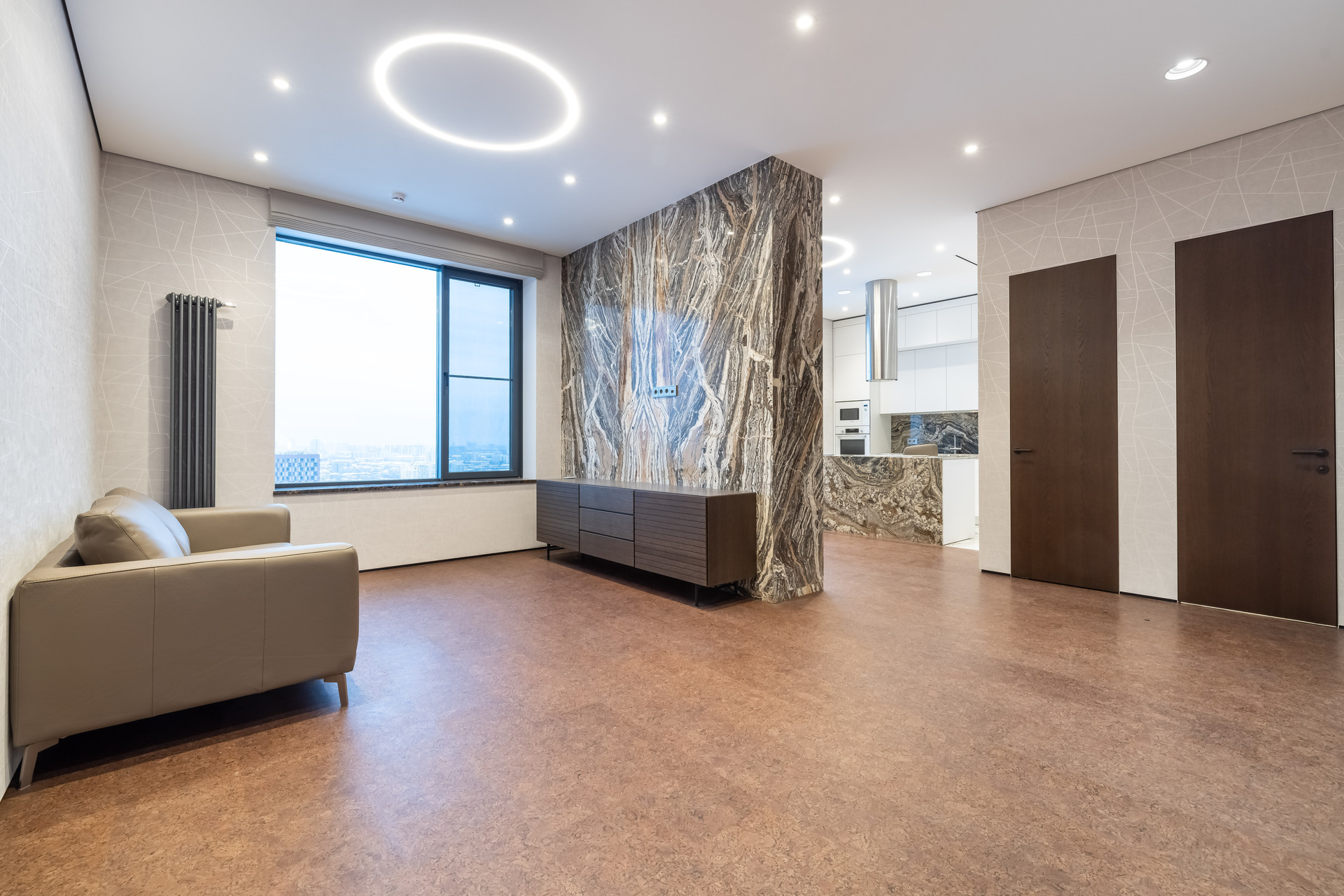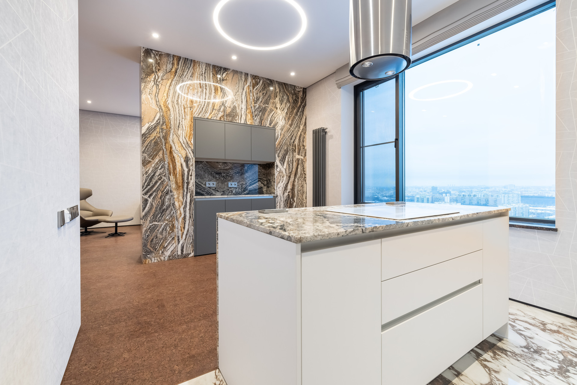 В прихожей и гостиной часть стен отделаны итальянским травертином Jurassico, подоконники из мрамор Emperador Dark (Испания), на кухне столешница и остров из итальянского гранита Amarone.