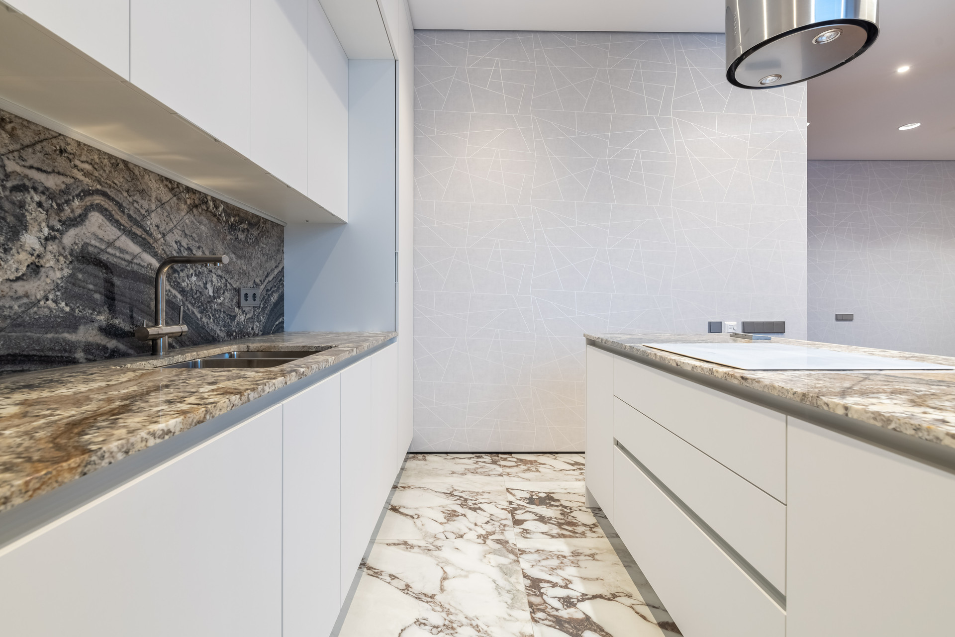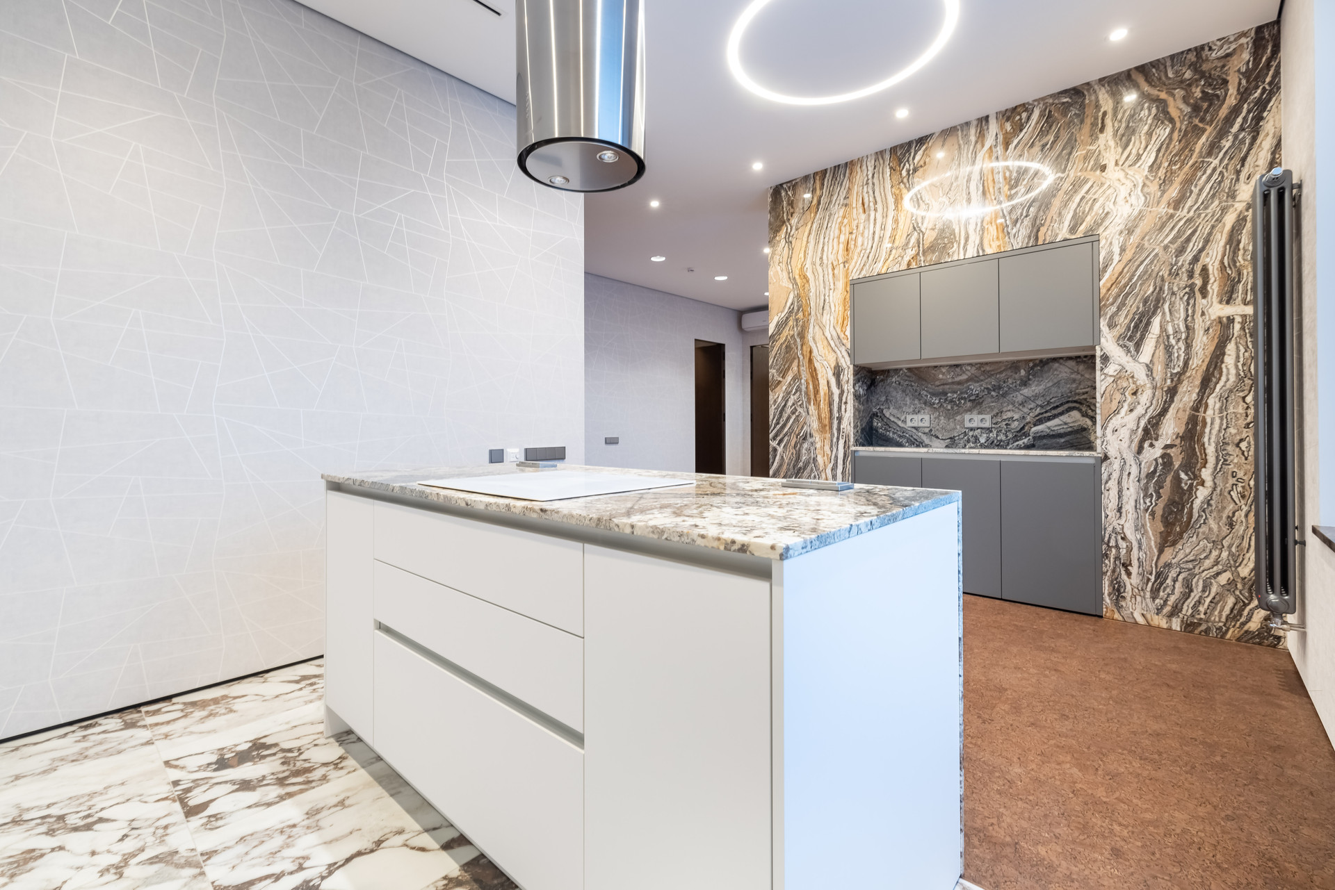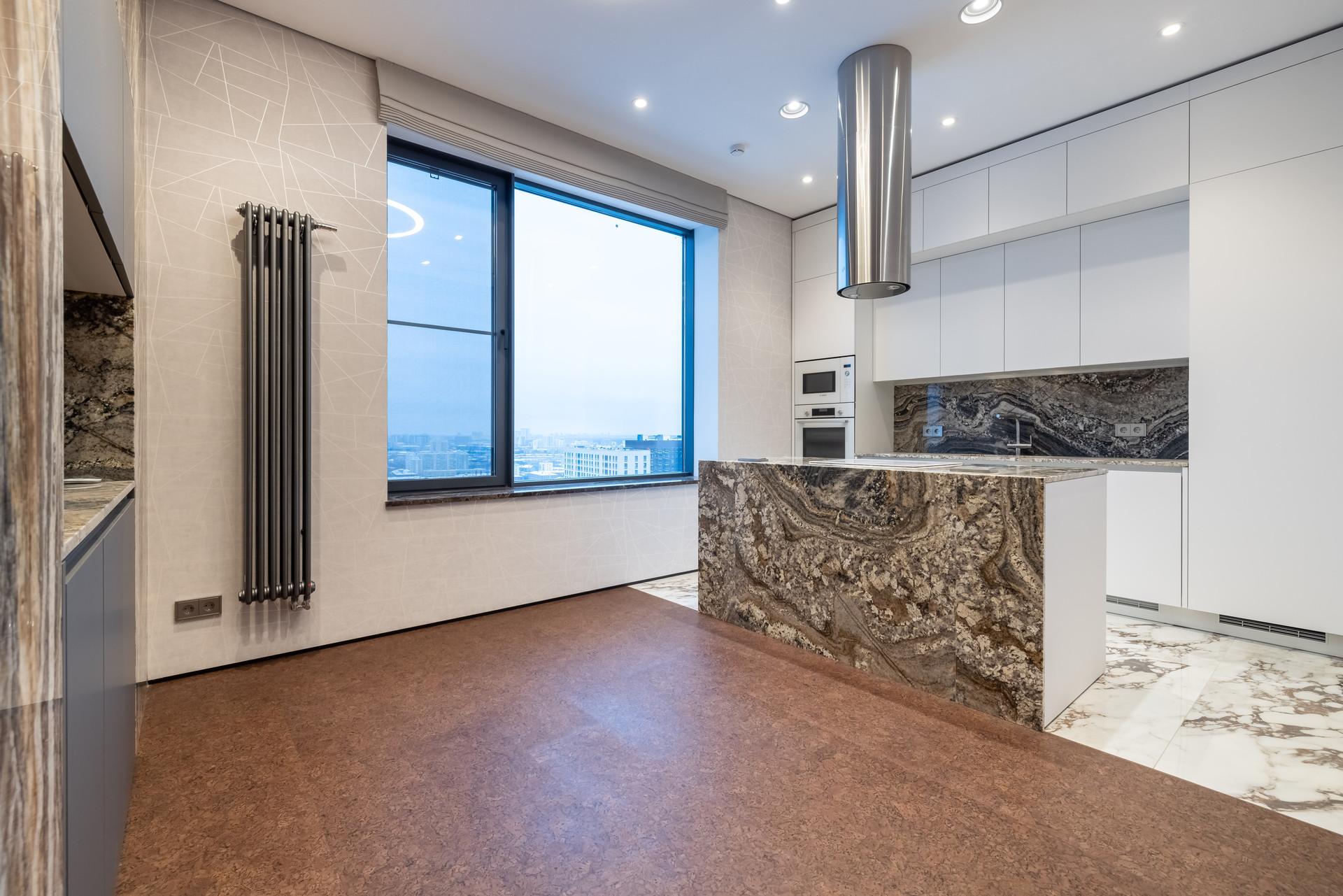 В прихожей и гостиной часть стен отделаны итальянским травертином Jurassico, подоконники из мрамор Emperador Dark (Испания), на кухне столешница и остров из итальянского гранита Amarone.