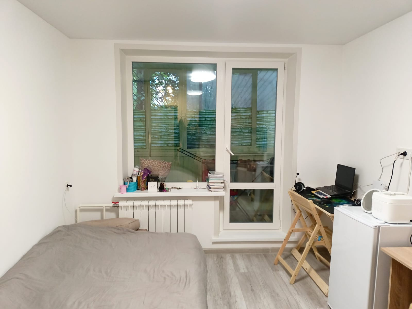 Окна студии выходят на нешумную внутреннюю улицу с большим количеством зелёных насаждений, сторона не солнечная, летом тенек и прохлада.