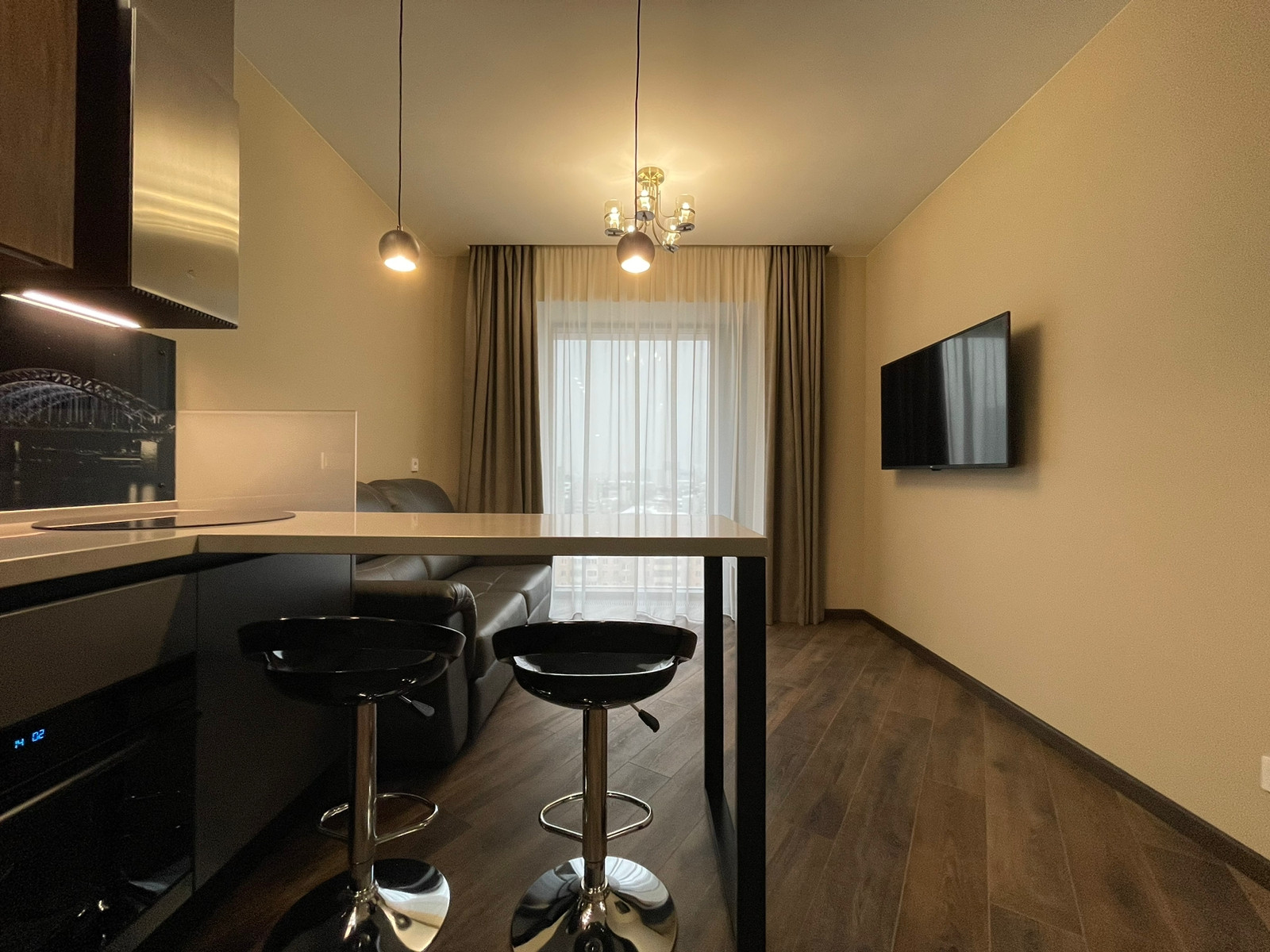 Просторная кухня гостиная, изолированная спальня с собственной гардеробной комнатой.