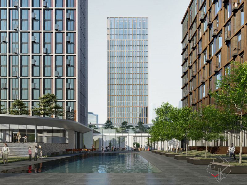 Архитектура комплекса спроектирована по классическому принципу разделения общественных и приватных пространств. Центром композиции является красивое административно-торговое здание, украшенное колоннадой, которое соединяет две жилые башни. Здесь расположены центральное лобби комплекса,  службой  консьержей, комнатой для переговоров, вход для курьеров, зоны отдыха и отдельными комнатами с примерочными, в которых жители будут получать посылки с онлайн-покупки. Здесь же расположены кафе и сервисы, выходящие на благоустроенную улицу. Через лобби жители попадают на закрытую территорию комплекса.