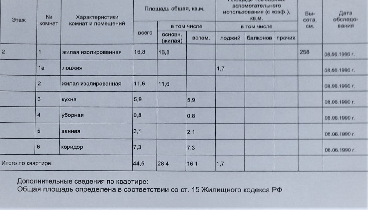 Общая площадь 44.5 м2