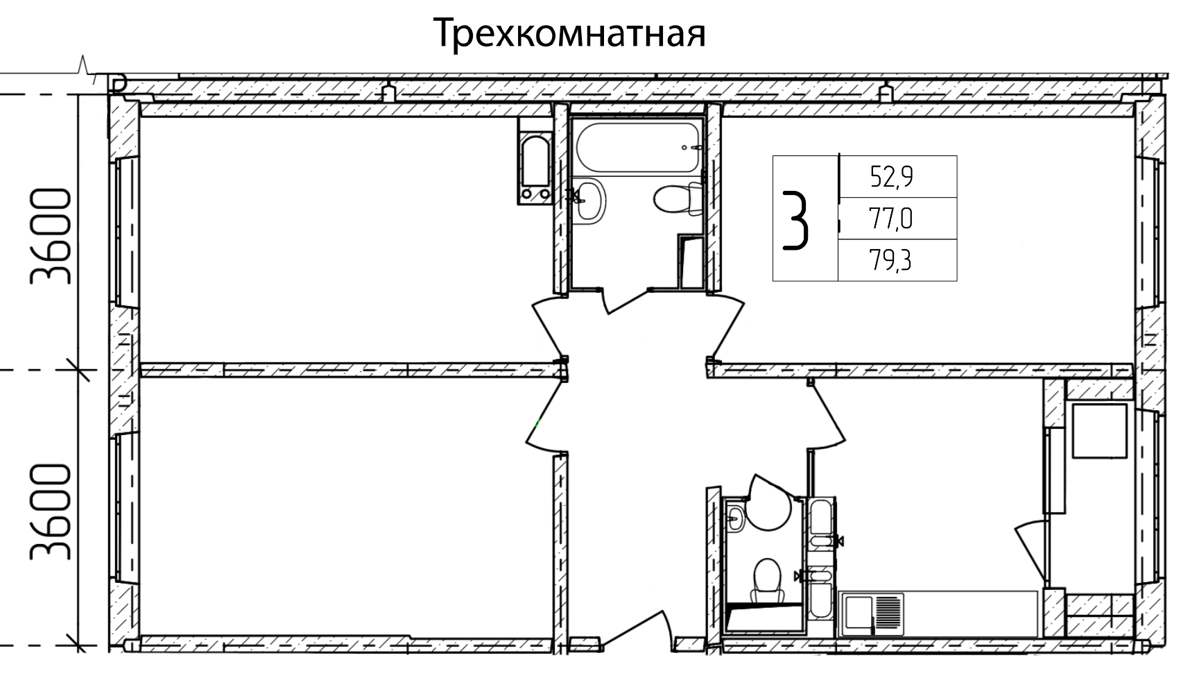 Трехкомнатная квартира, 79,3 кв.м. (без лоджии - 77,0 кв.м). ЖК "Квартал Некрасовка".