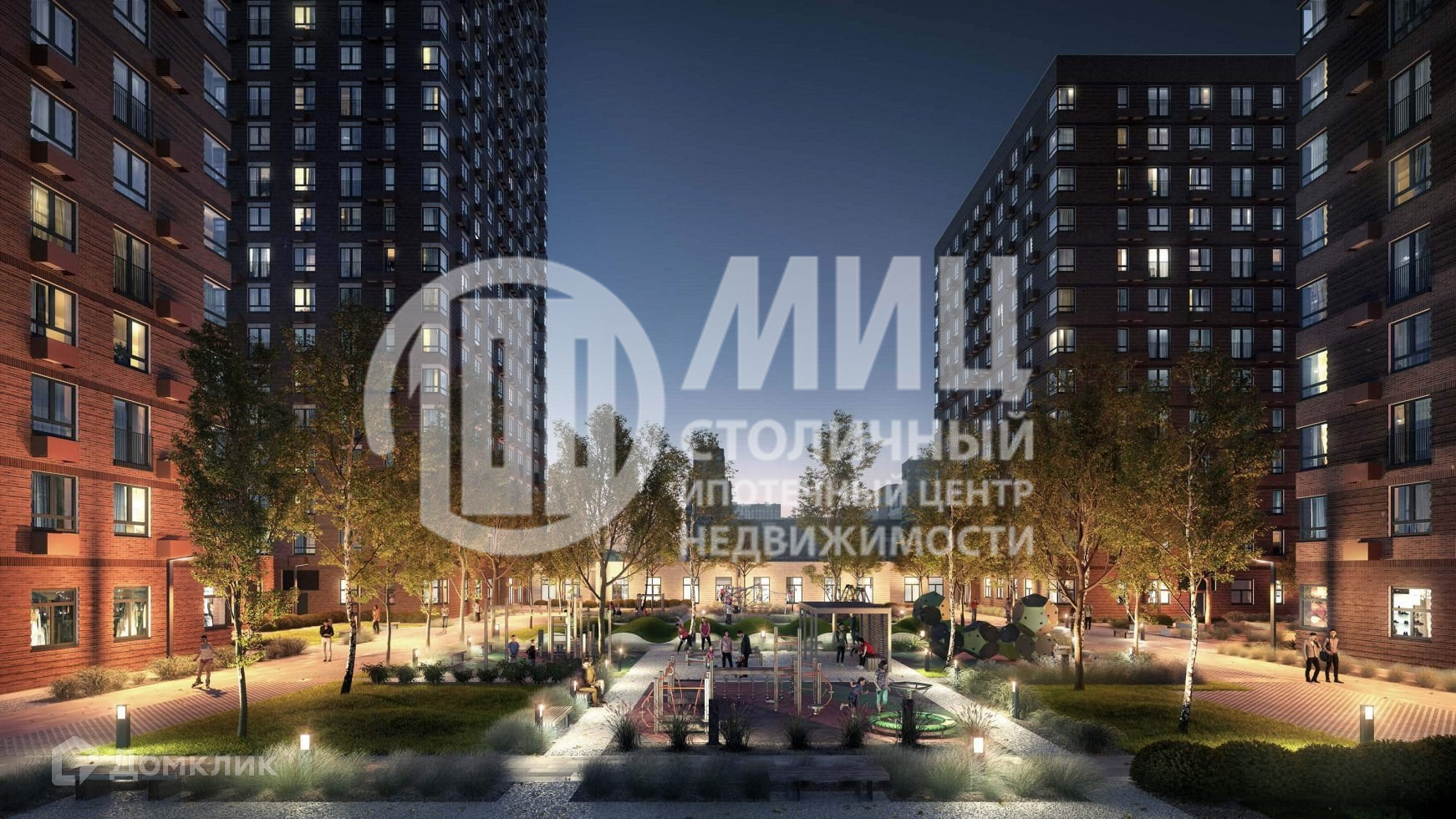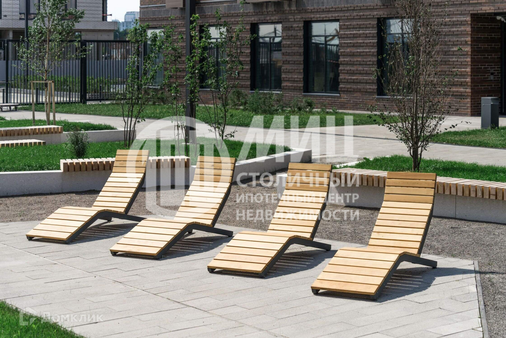 зеленый парк-дворик с детскими площадками;