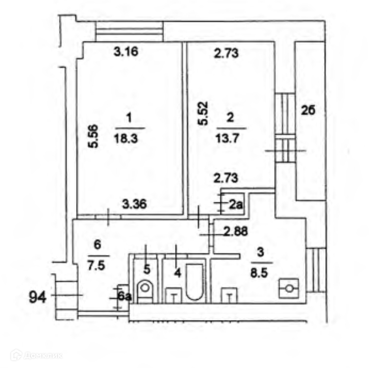 Общая площадь 52.6 м2