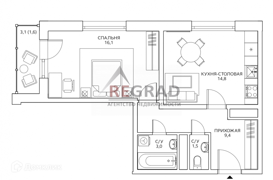 Общая площадь 46.4 м2