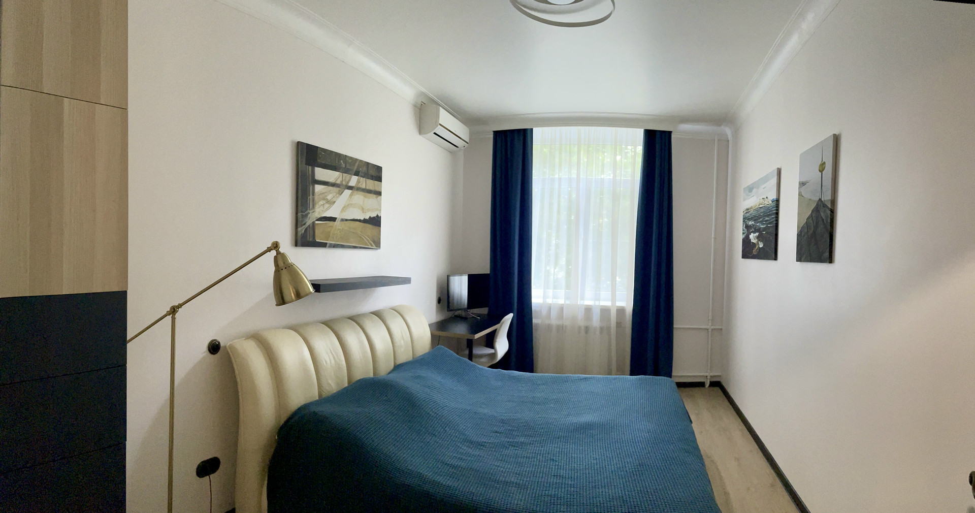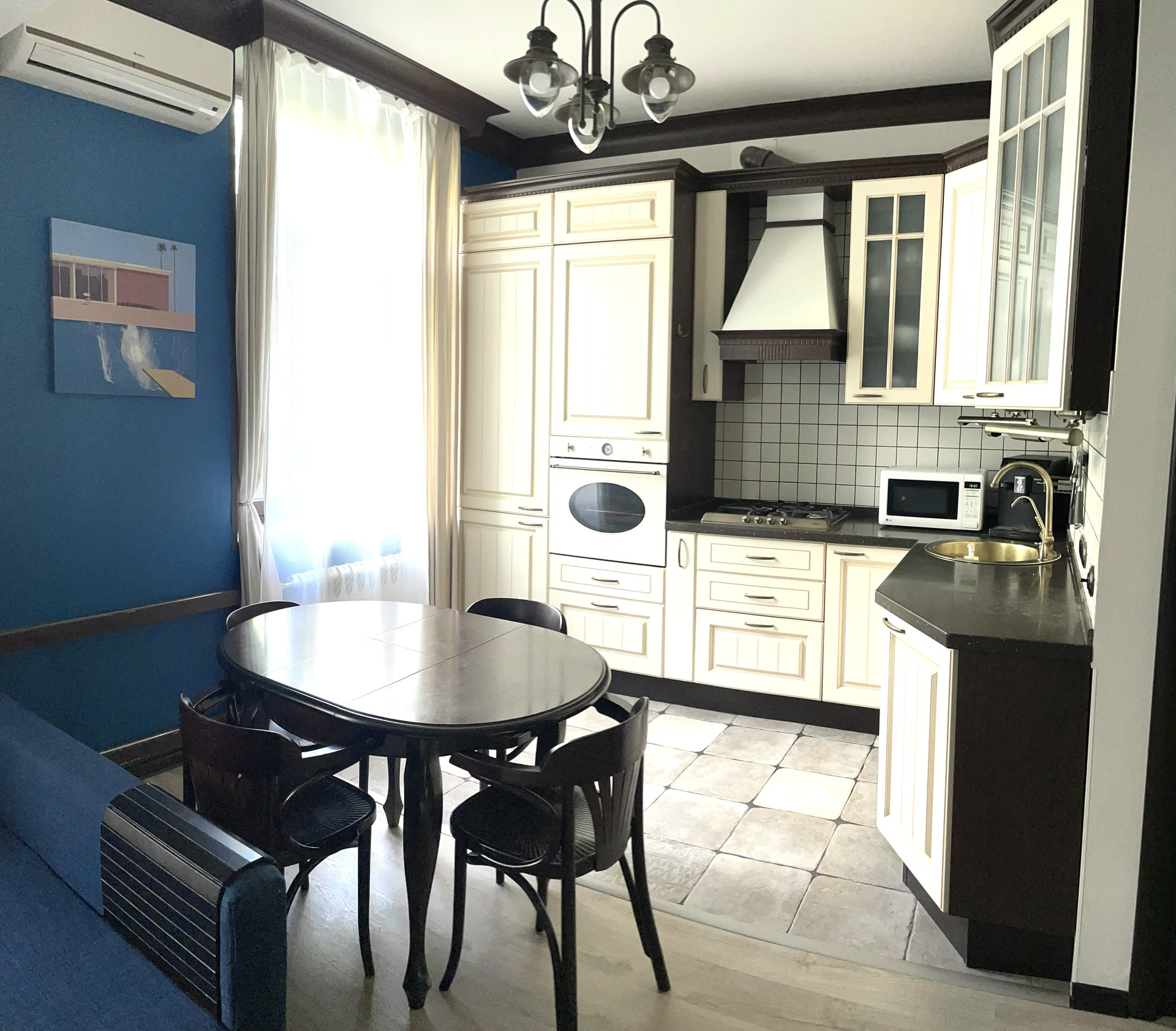 Два встроенных шкафа и гардеробная по индивидуальному дизайн-проекту. Кухня МАРИЯ со встроенной техникой (холодильник LIEBHERR, духовой шкаф SMEG , варочная панель SMEG, посудомоечная машина), накопительный водонагреватель на время отключения ГВС, встроенный сейф, три кондиционера. Охранная сигнализация. Домашний телефон. Интернет.