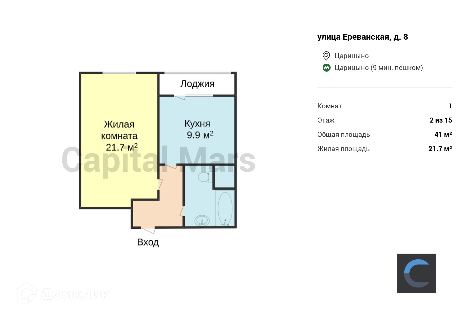 1-комнатная квартира, 41 м2, этаж 2 / 15, на продажу в Москве, Ереванская улица, 8