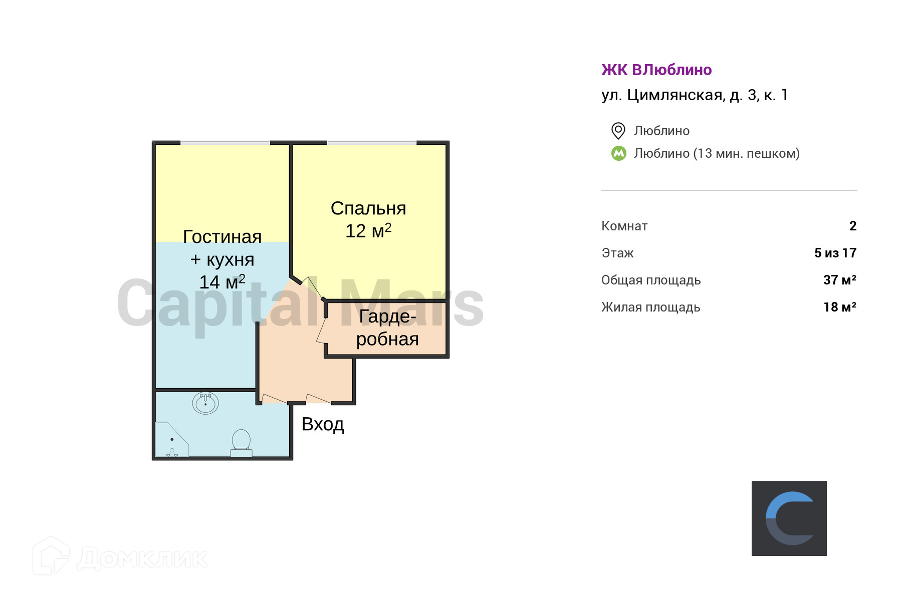 2-комнатная квартира, 37 м2, этаж 5 / 17, на продажу в Москве, Цимлянская улица, 3к2