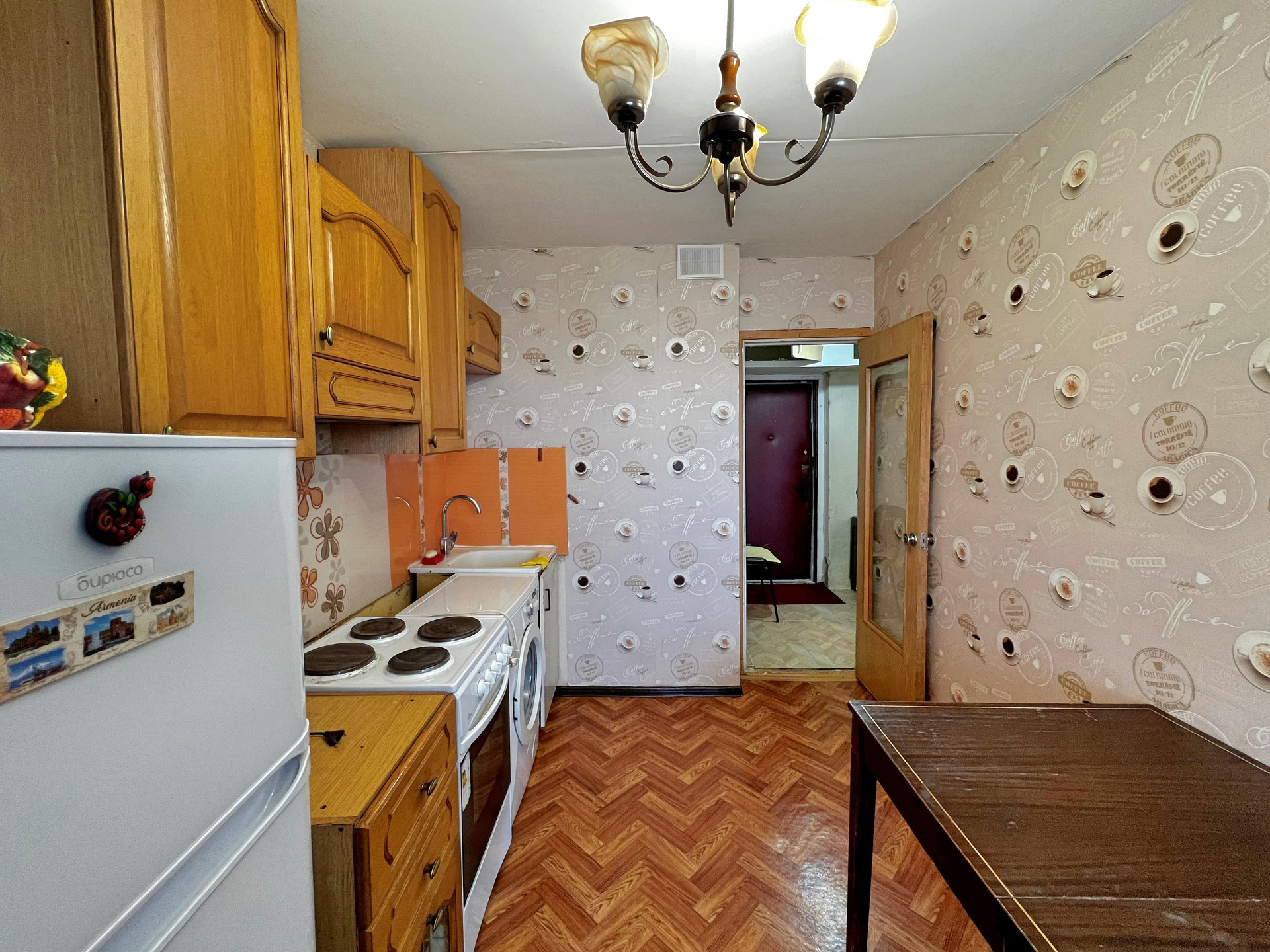 Большая кухня 9.8м2, большая лоджия (6м2), железная дверь, плита электрическая.