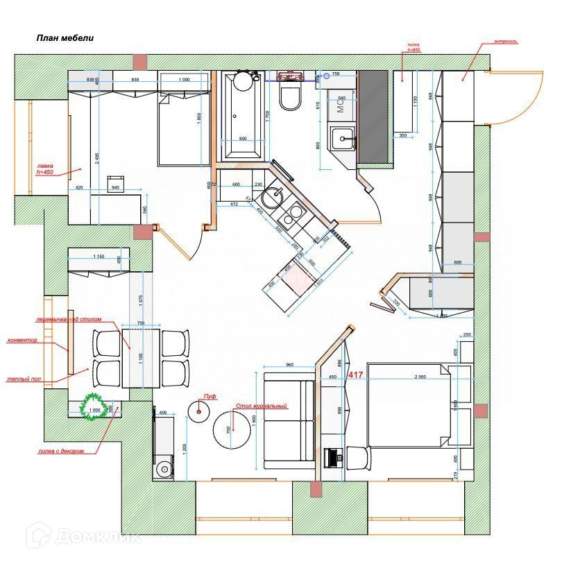 Спальня, детская, кухня-гостиная и небольшое рабочее место с био-камином. В квартире обеспечена звукоизоляция на полу и стенах. Теплые полы. Квартиру делали для себя, поэтому использованы качественные материалы. Пространство  продумано до мелочей, очень много мест для хранения. Вся мебель сделана на заказ по эскизам дизайнера из Еggеr. Продуманные световые сценарии.