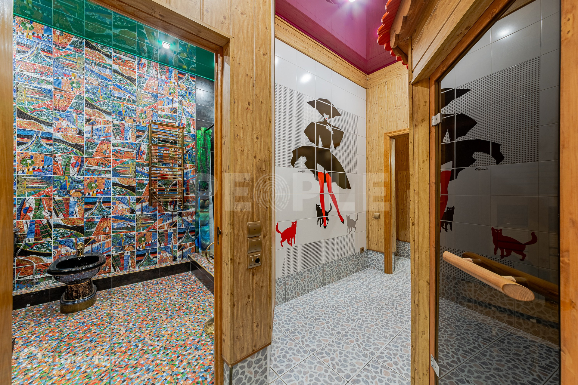 Мастер спальня находится в удаленной части квартиры со своей приватной ванной комнатой и большой САУНОЙ в отдельном пространстве. Из мастер спальни есть второй выход в гостевую туалетную зону, где расположены ванная комната и отдельное помещение в качестве постирочной.