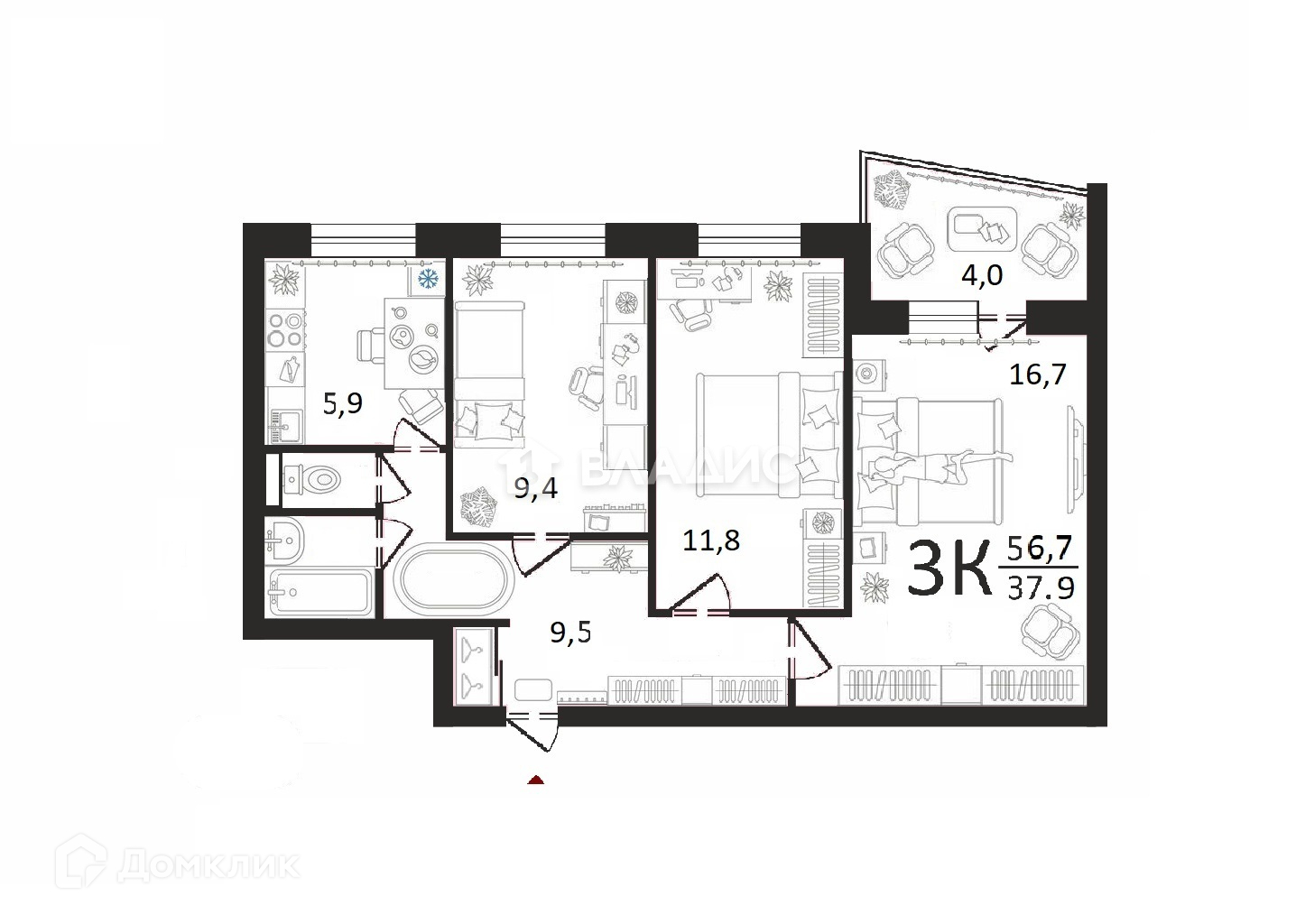 Общая площадь 56.7 м2