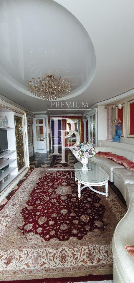 В квартире следующее планировочное решение: кухня-столовая с дорогой встроенной итальянской мебелью, шикарная холл-гостиная, три изолированные спальни: одна из них мастер-спальня с гардеробом и санузлом, еще две спальни с ванной и гардеробной, постирочная, два совмещенных санузла - один из них с джакузи, большое количество встроенных шкафов. Выход из гостиной на собственную террасу, Дизайнерский ремонт, выполнен из дорогостоящих материалов: пол - мрамор, стены - лепнина, двери - массив. Мебель, техника - всё остается. Фото не передают весь колорит, лучше один раз увидеть!