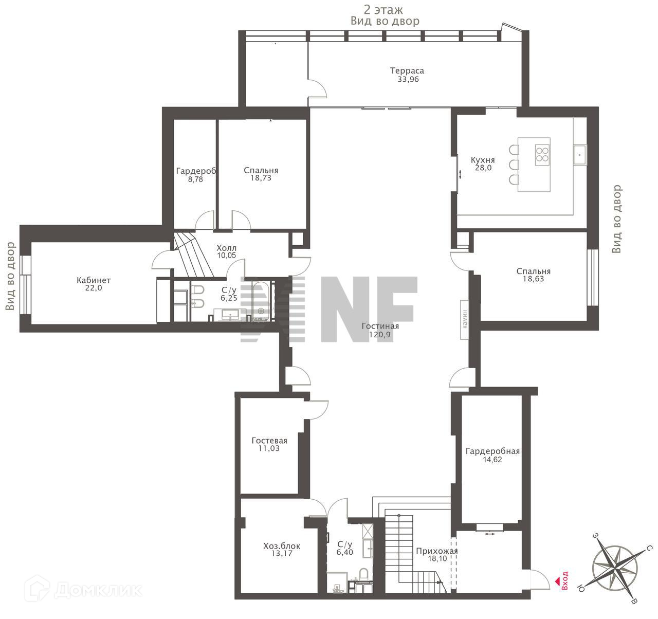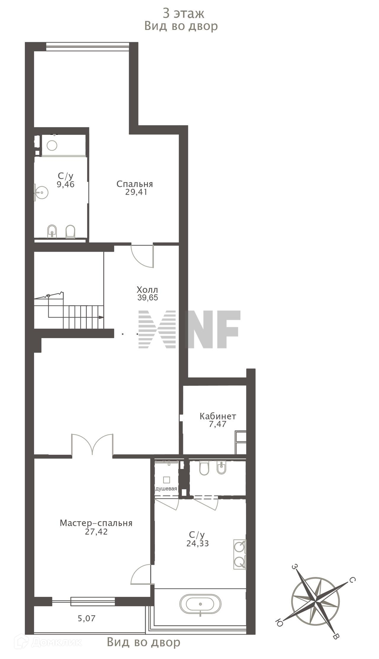 Планировка: просторная гостиная-столовая, зимний сад, изолированная кухня, мастер-спальня с ванной, большой гардеробной и зоной кабинета, 3 спальни с ванными комнатами и гардеробными, гостевая спальня или кабинет, гостевой санузел, постирочная. Есть открытая терраса и лоджия.