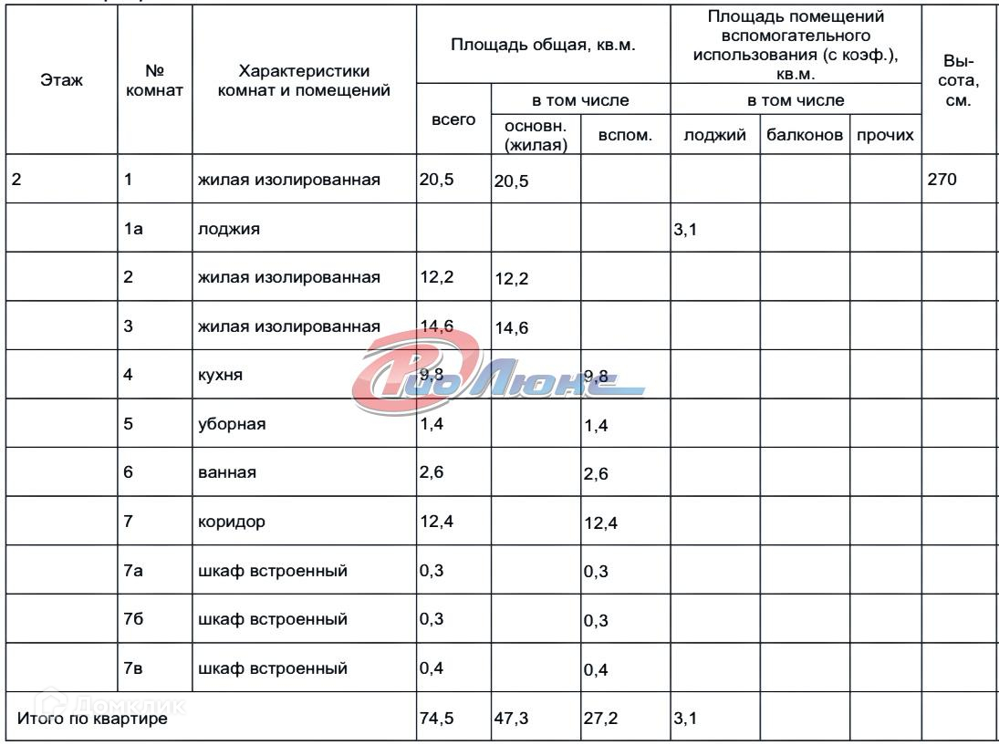 Общая площадь 74.5 м2