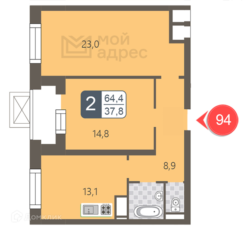 Общая площадь 64.4 м2