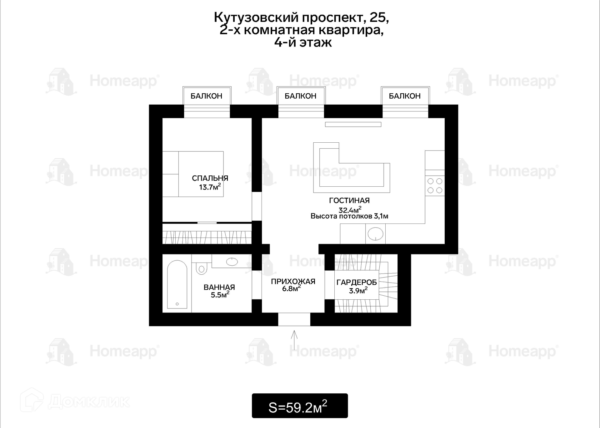 В приватной зоне - спальня 13,7 м² с обширным пространством для хранения вещей, вместительная гардеробная 3,9 м², просторный санузел 5,5 м² с полноценной ванной.