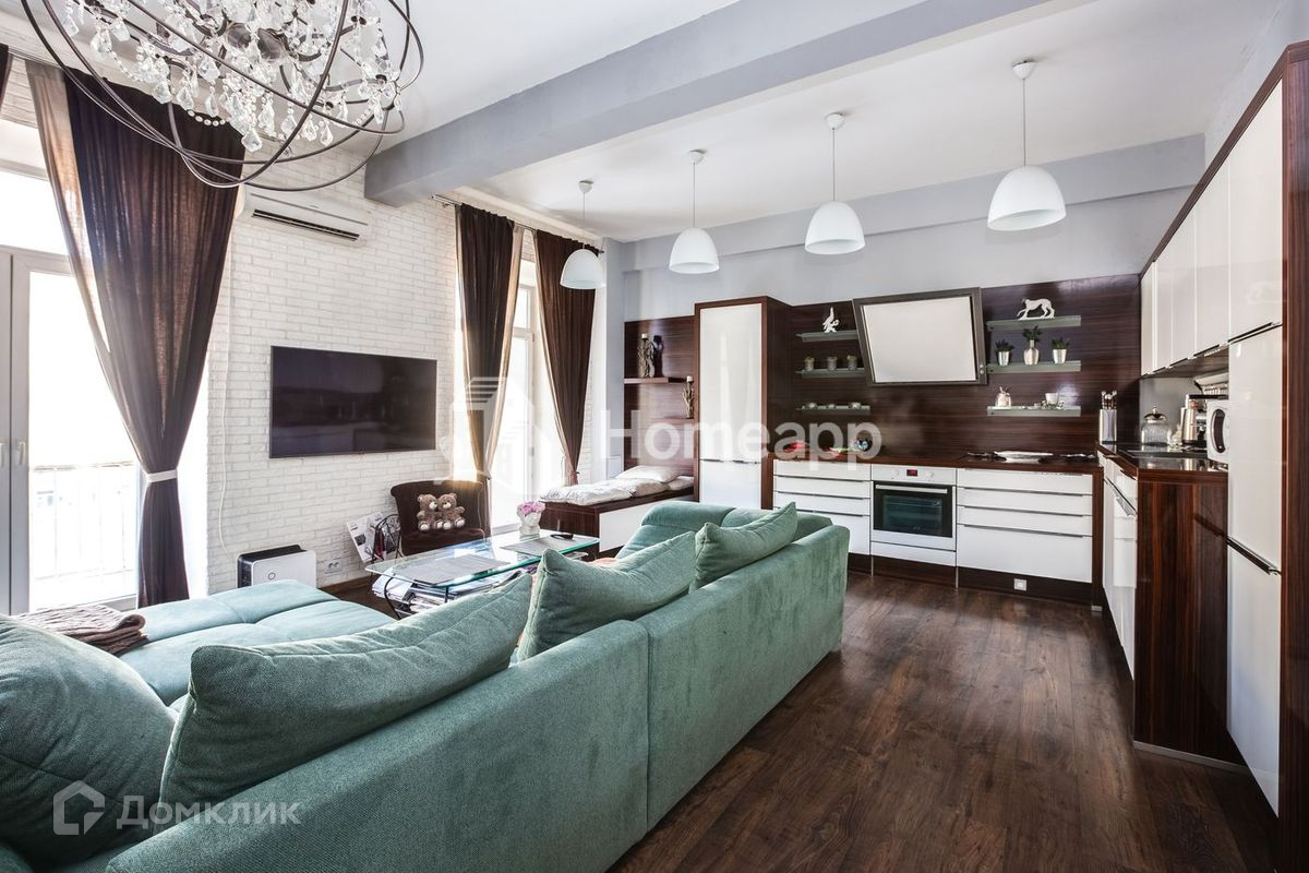В гостевой зоне - просторная кухня-гостиная 32,4 м² со встроенной современной техникой (холодильник, посудомоечная и стиральная машины, варочная панель, духовой шкаф), выделено место приготовления и приёма пищи, а также пространство для отдыха. Гостиная очень светлая - установлены 2 больших окна от пола до потолка с выходом на балкон. Отличные виды на "Москва-Сити".