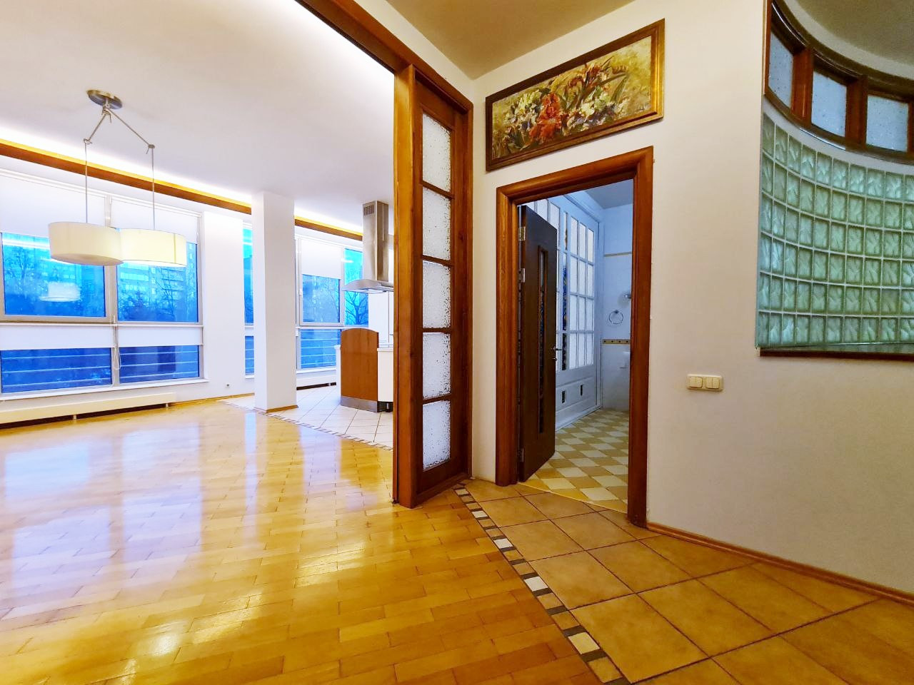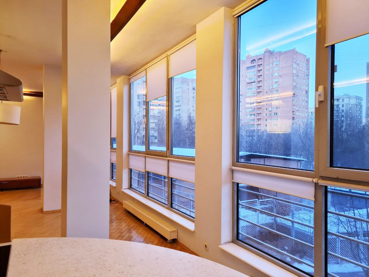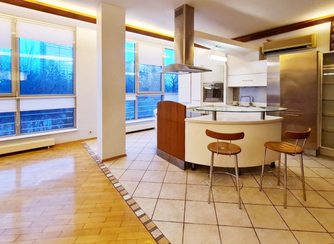 Авторский дизайн: огромная кухня-гостиная с панорамным остеклением; 3 изолированных спальни отделены от гостиной кабинетом; 2 гардеробные, 2 просторных санузла, удобная прихожая. Все межкомнатные перегородки - из кирпича. Квартира полностью оборудована встроенной итальянской мебелью и технически оснащена. Толстые стены по периметру, высокие потолки, большие окна и прозрачные вставки способствуют естественному освещению в дневное время и настоящему уюту - в вечернее.