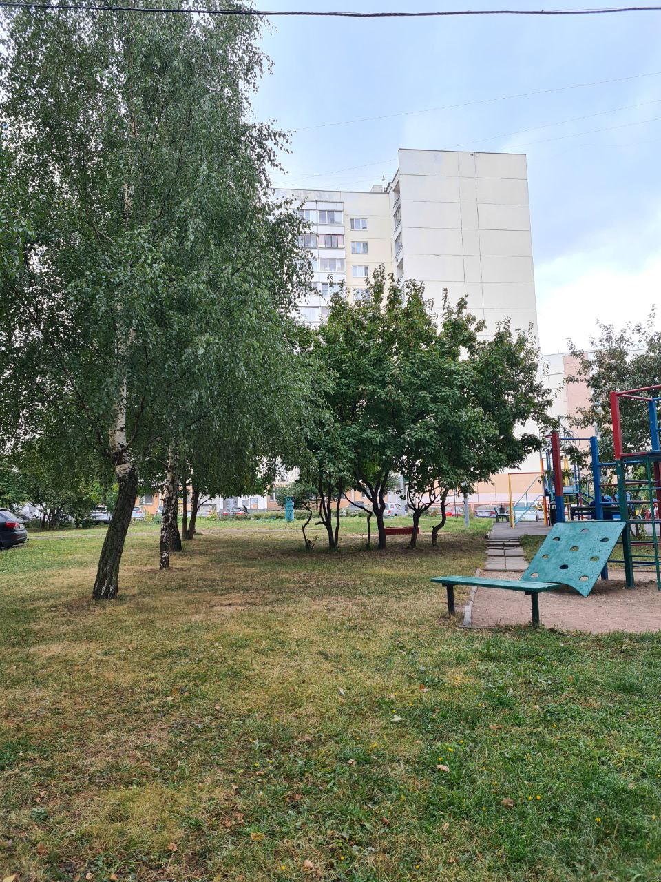 прекрасный, уютный двор с детскими площадками, качелями, тренажёрами.
