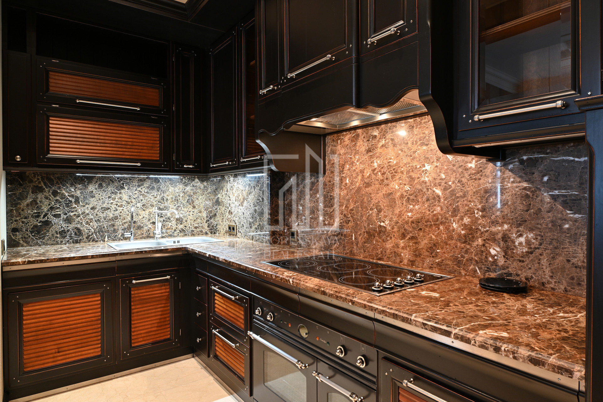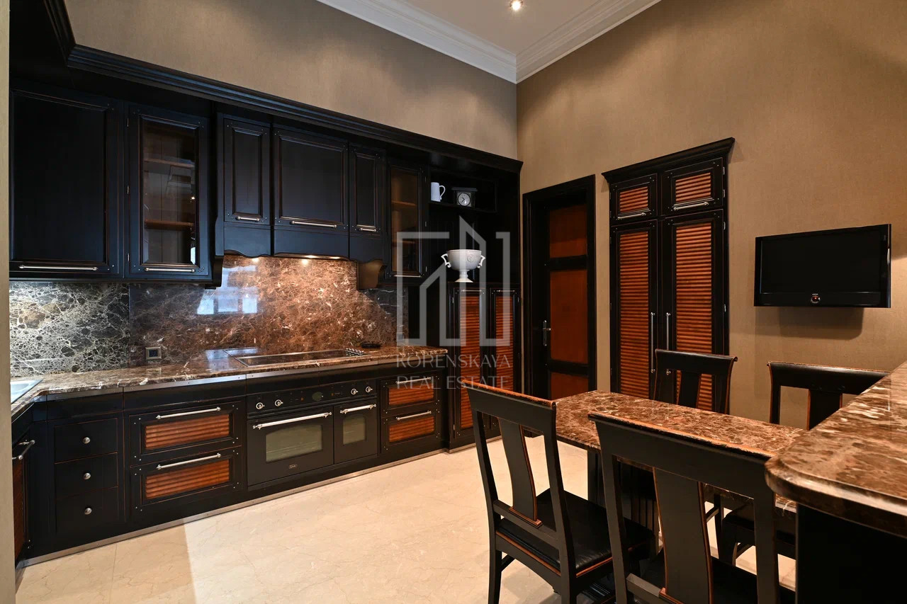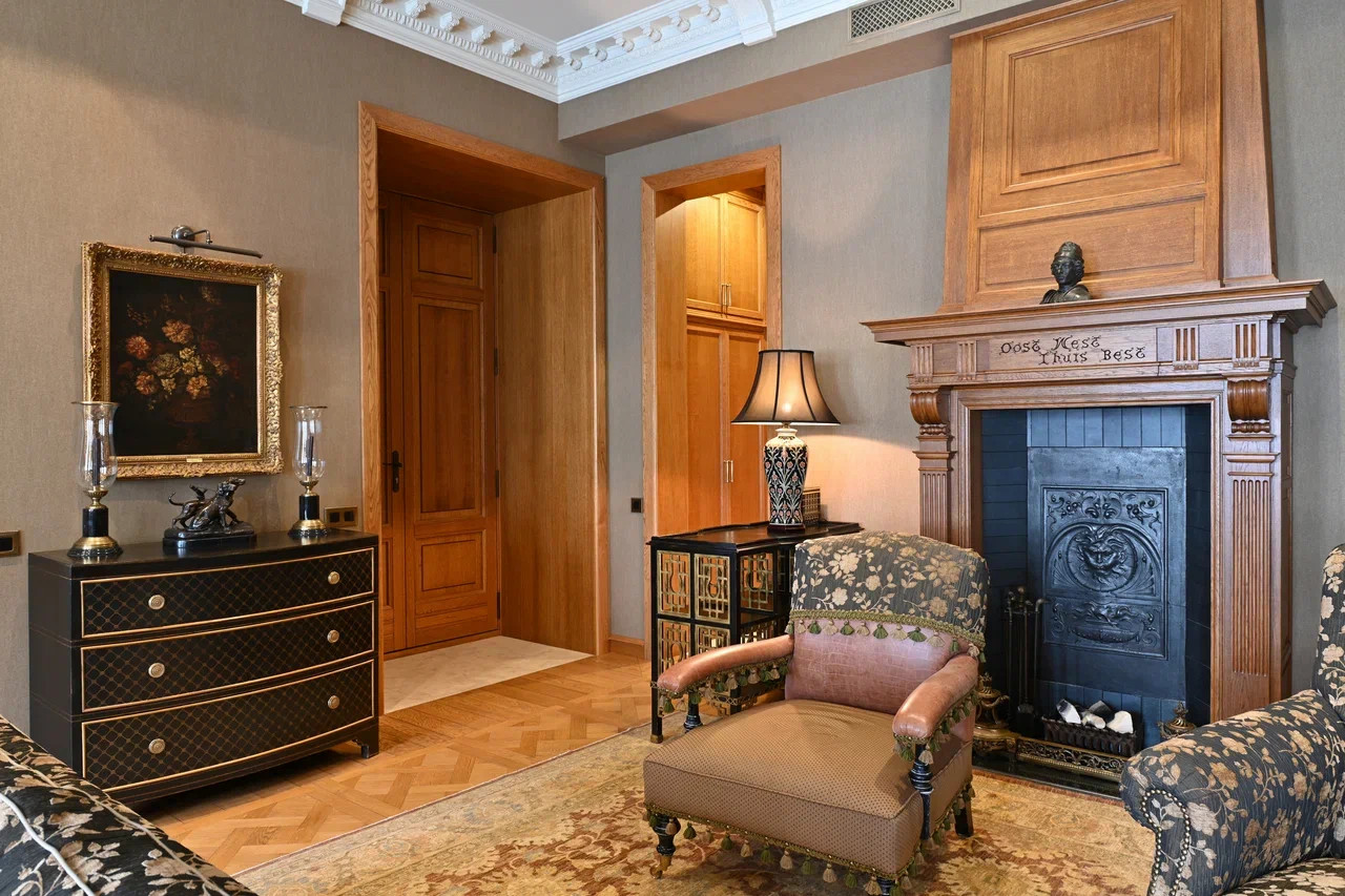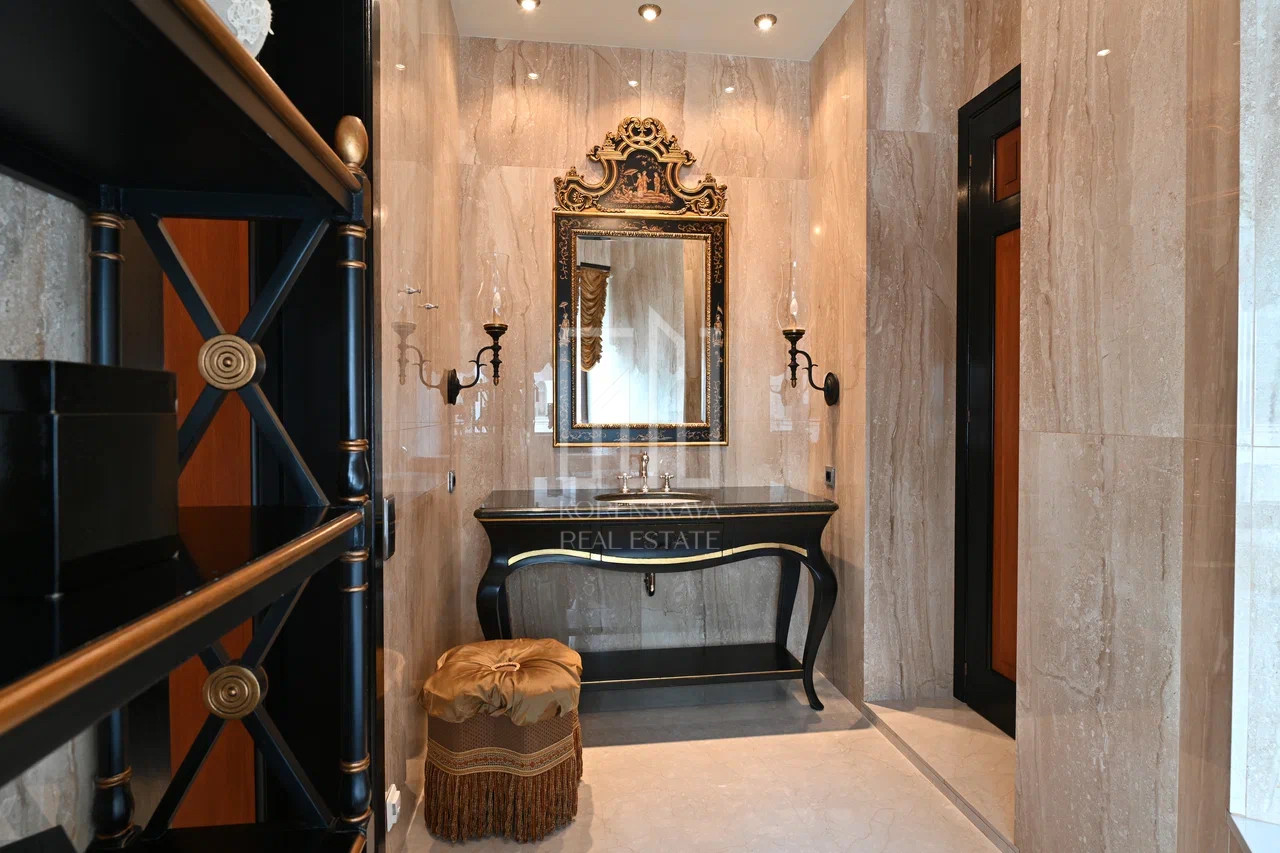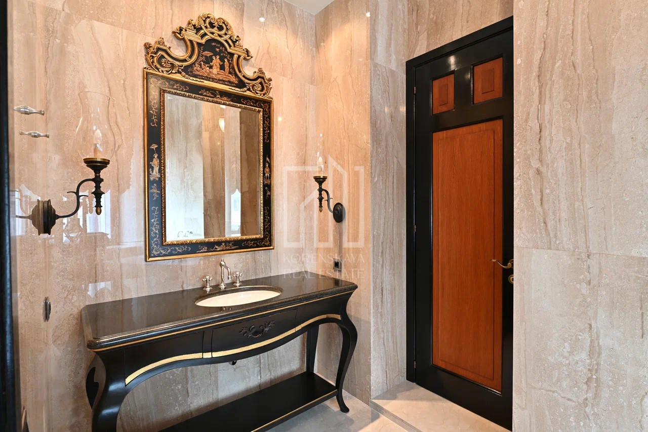 Дизайн интерьера выполнен в стиле американской классики, в отделке использованы натуральные отделочные материалы высокого качества, в интерьере присутствуют антикварные предметы искусства и мебели. Комплектация объекта ведущими брендами: Devon&Devon, Villeroy&Bosh, Drixel Heritage, Colombo Mobili, Ralfph L.