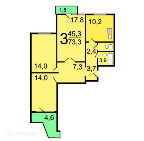 Общая площадь 73.3 м2