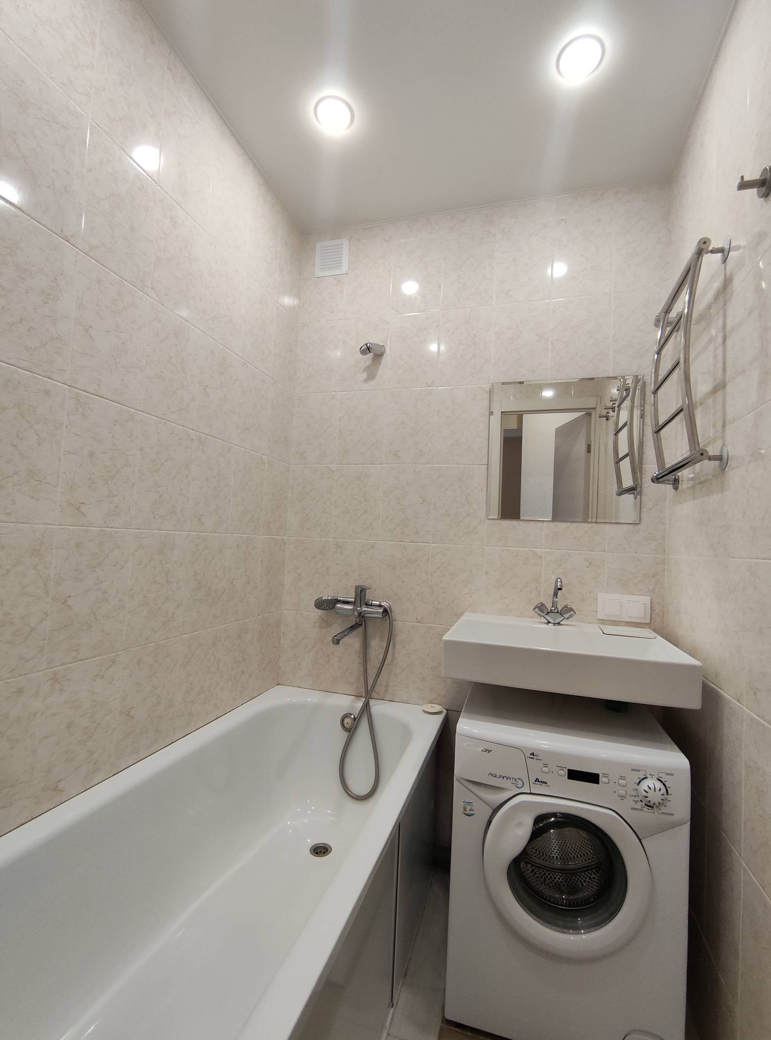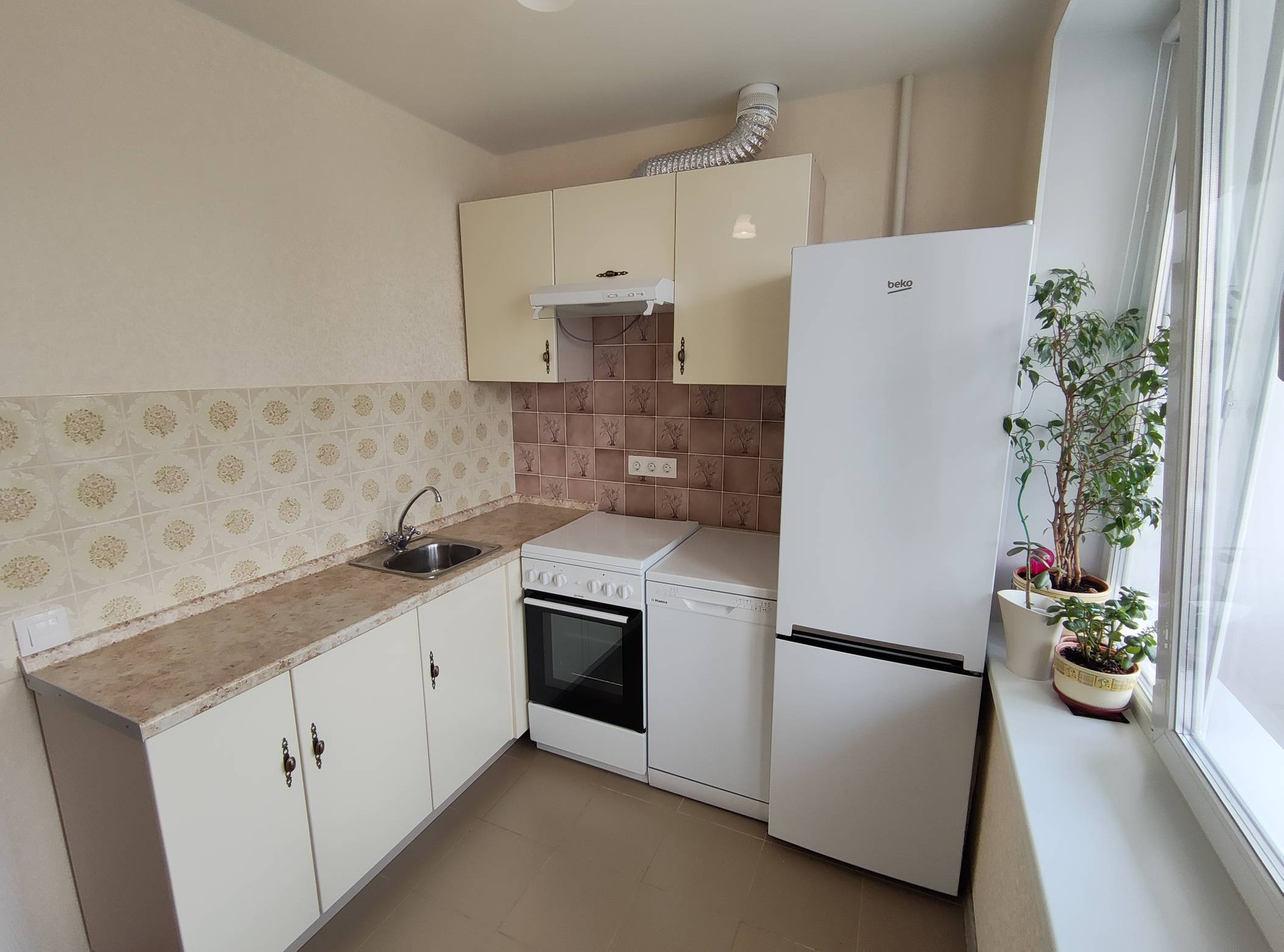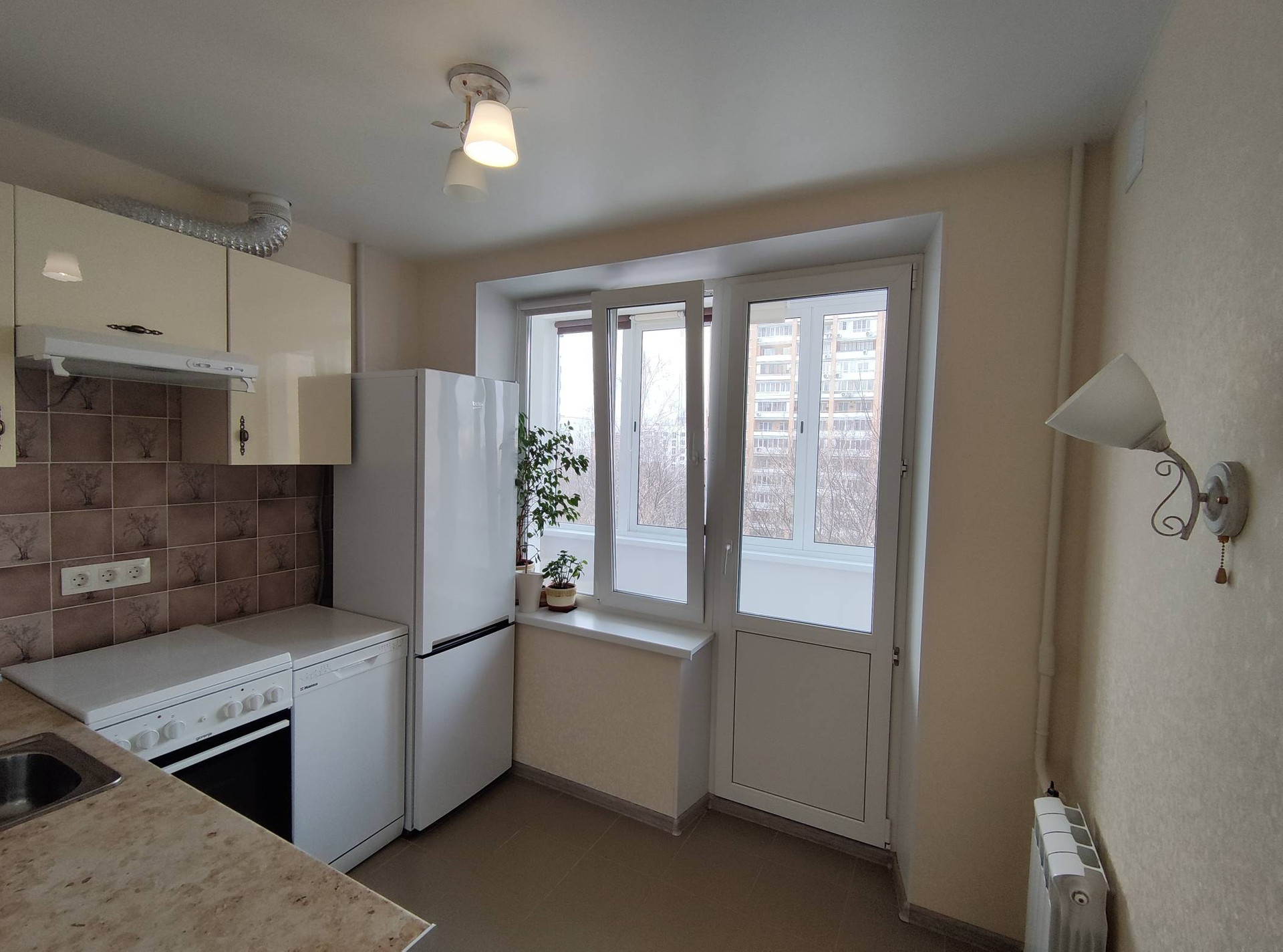 В квартире остается новая кухня и техника: холодильник, посудомоечная машина, плита, вытяжка, стиральная машина.