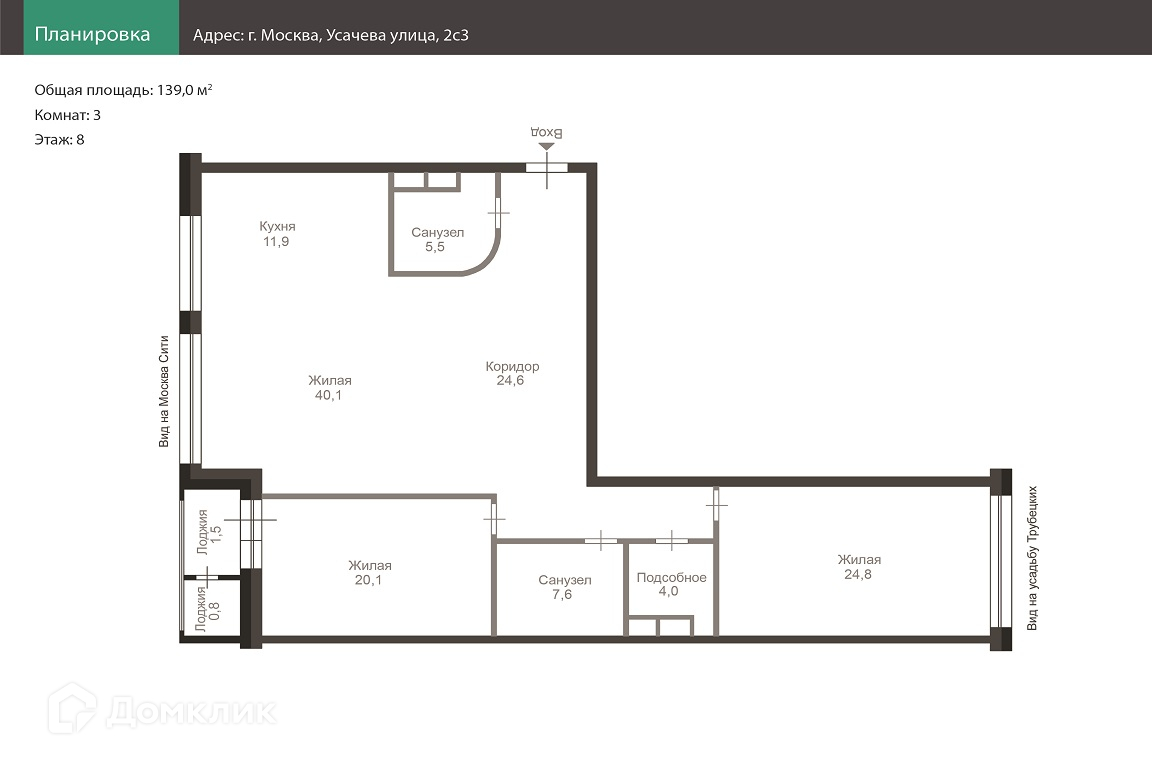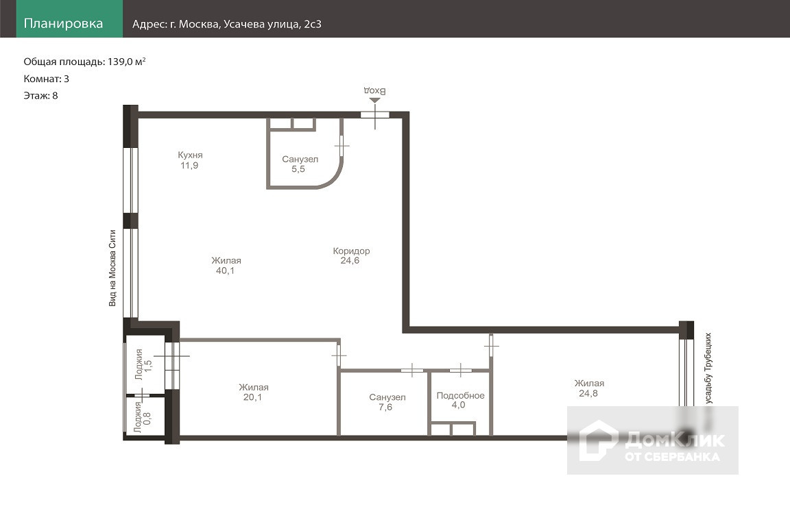 3-комнатная квартира, 139 м2, этаж 8 / 22, на продажу в Москве, Усачёва улица, 2с3