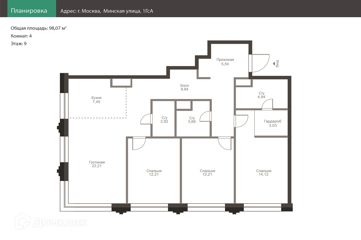 4-комнатная квартира, 98.07 м2, этаж 9 / 22, на продажу в Москве, Минская улица, 1ГсА