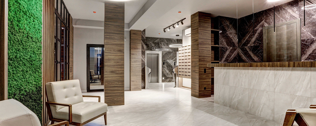 Лобби и места общего пользования будут оформлены в минималистичном скандинавском стиле, который характерен сочетанием камня, дерева и современного освещения.