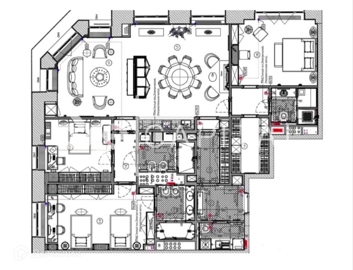 По планировке полагается 4 комнаты, 3 полноценные спальни со своими санузлами, большая гостиная, гостевой санузел и кухня-столовая. Так же в квартире имеется сауна.