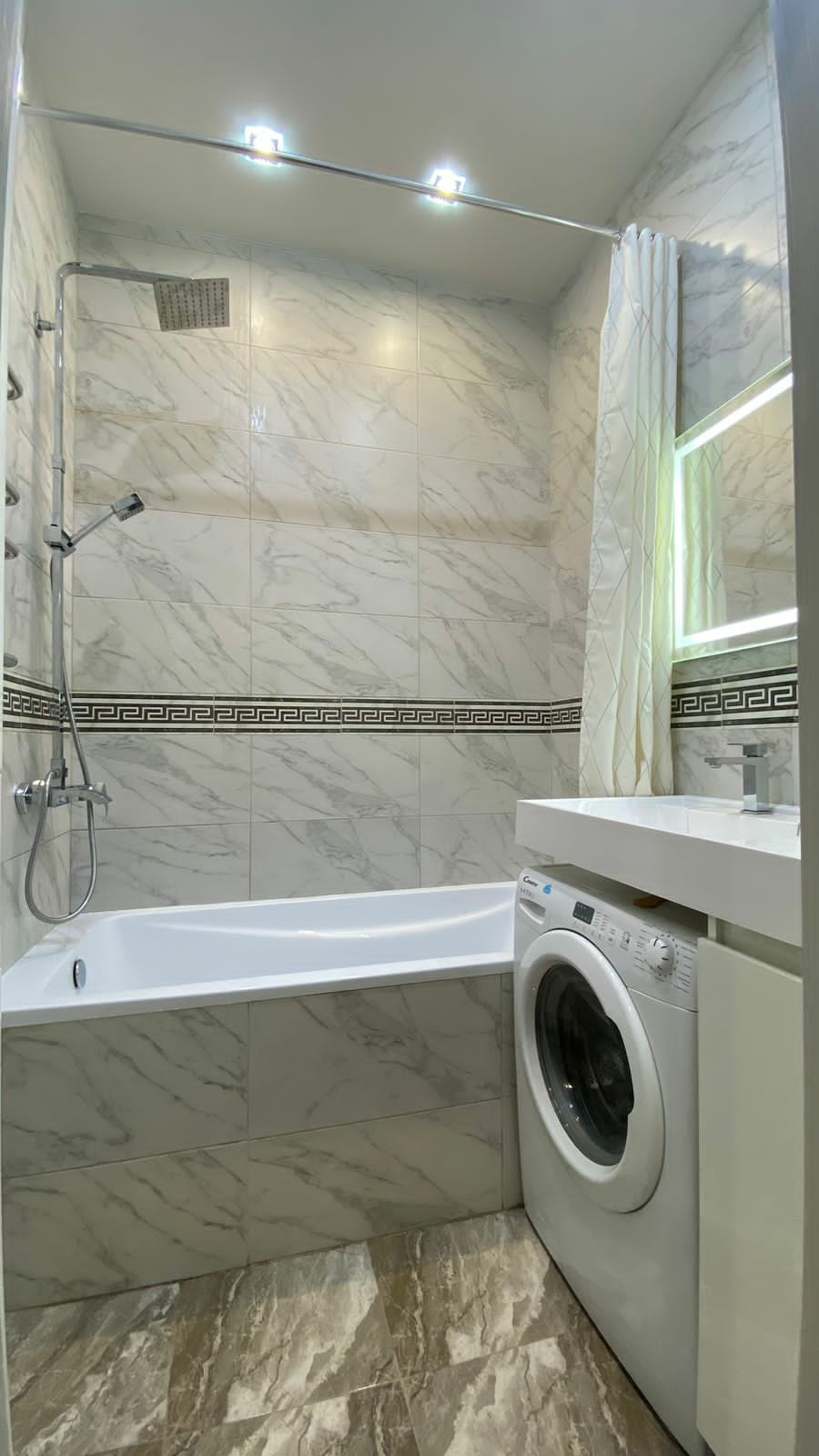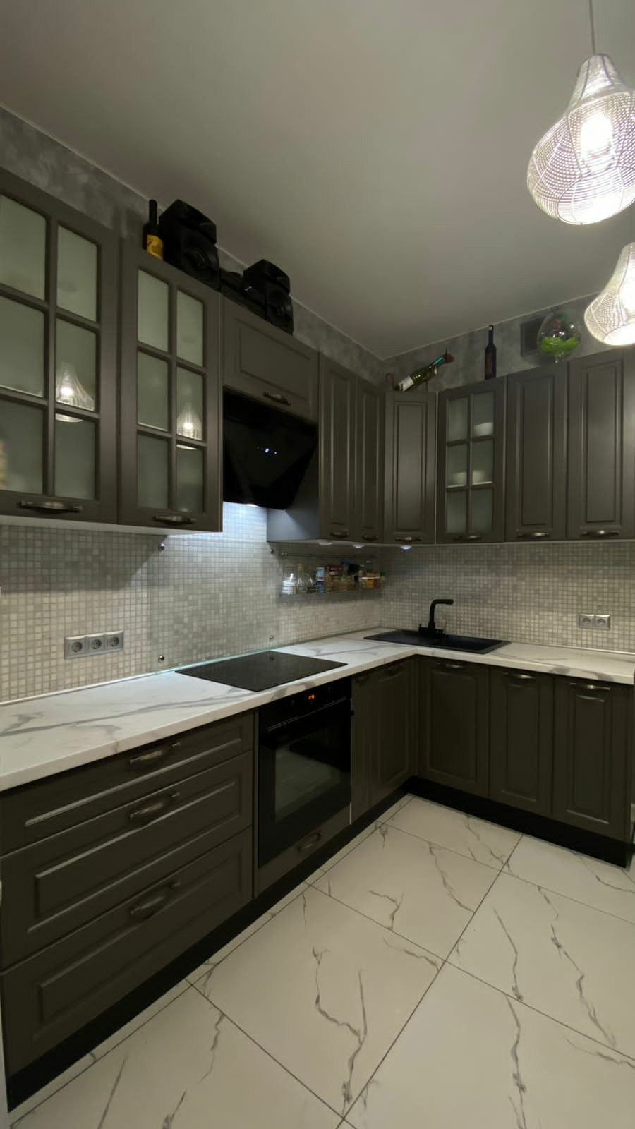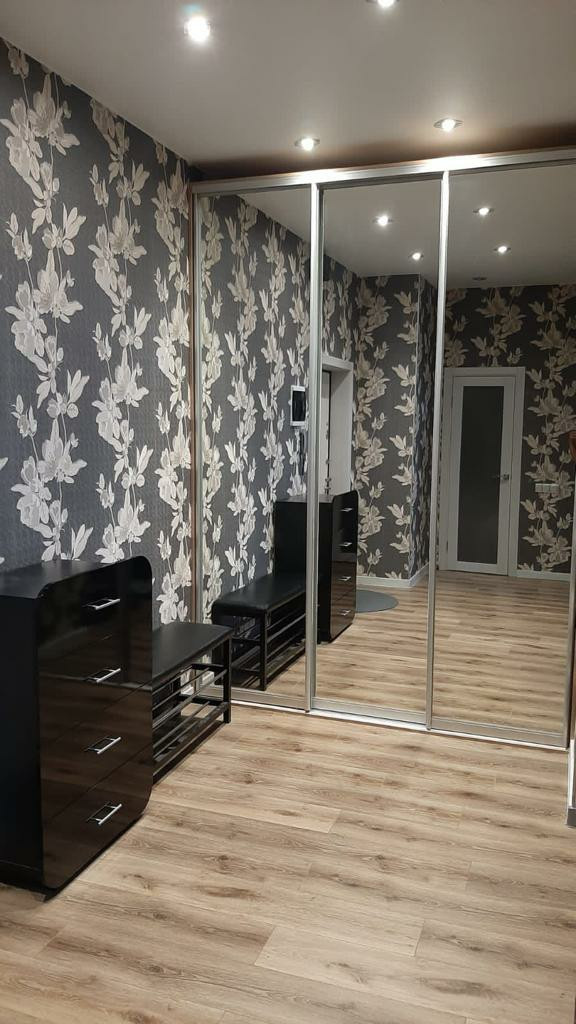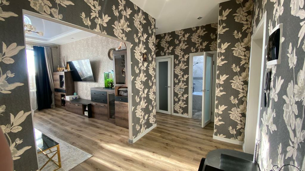 изготовленная на заказ кухня оборудована встроенной техникой: холодильник, стиральная машина, посудомоечная машинка, духовой шкаф, варочная панель, вытяжка - все входит в стоимость. На полу - керамогранит,натяжные потолки.