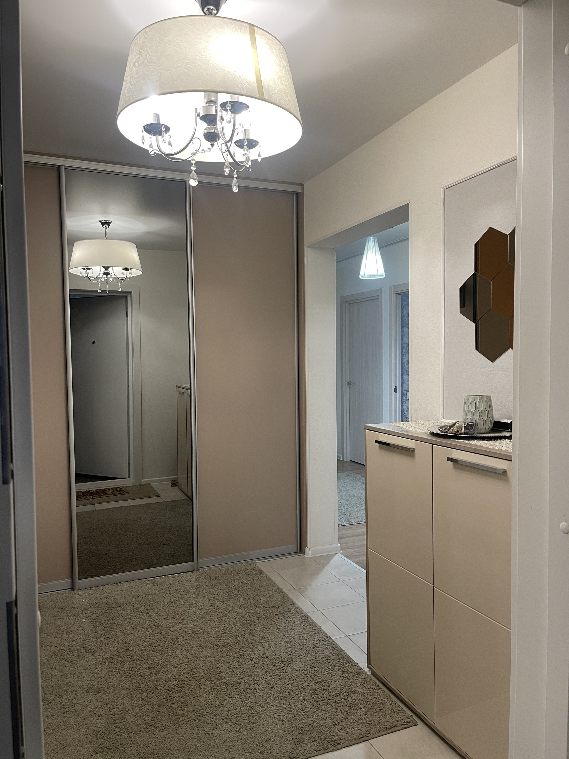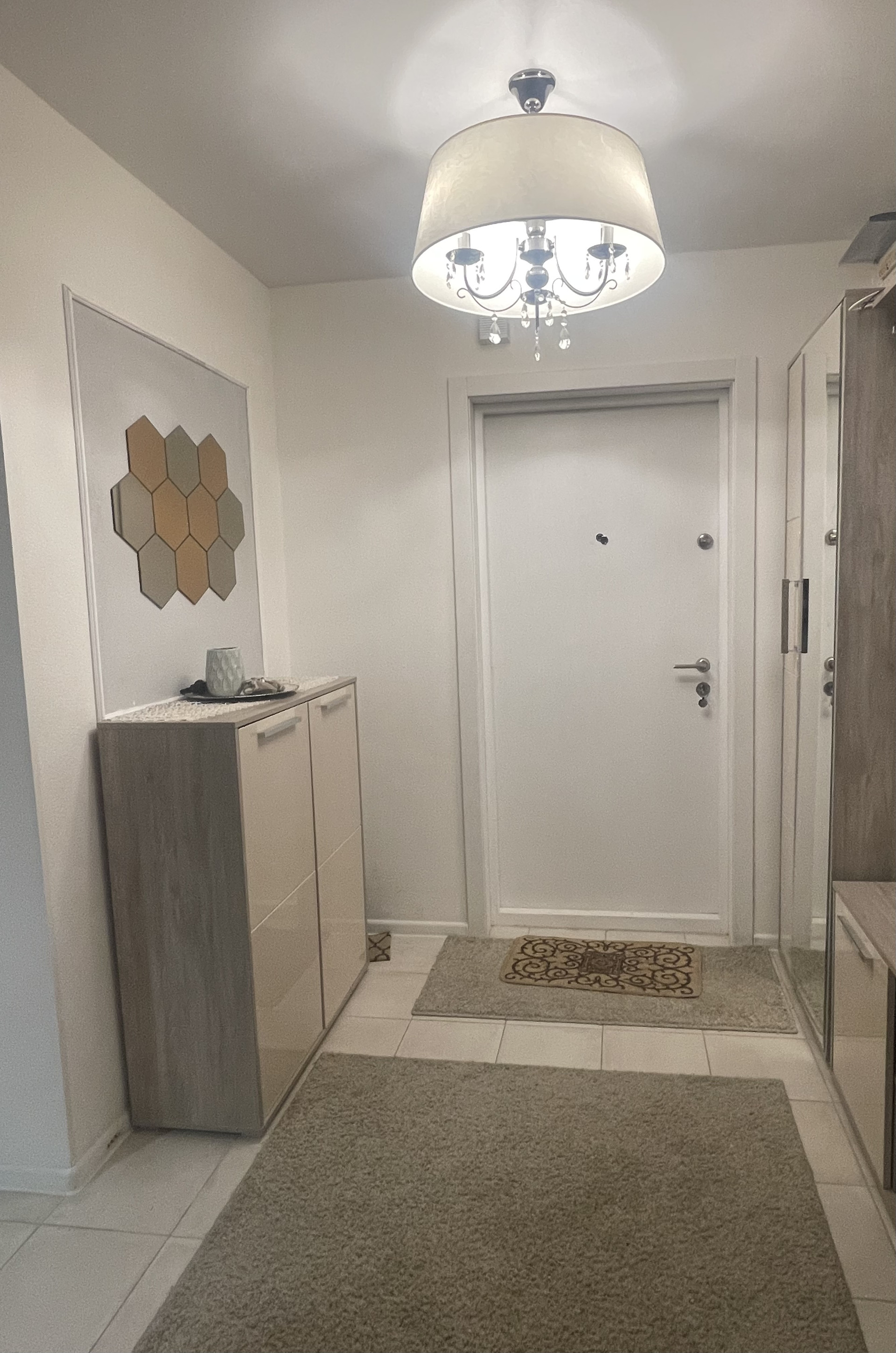 большая прихожая с закрытой гардеробной и два холла. Окна выходят во внутренний двор(виден детский сад и школа)и во внешний(не на Боровское шоссе).
