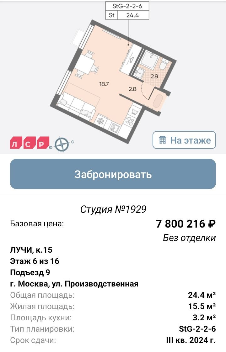 Квартира студия, 24.4 м2, этаж 6 / 16, на продажу в Москве, Производственная улица, 12к2
