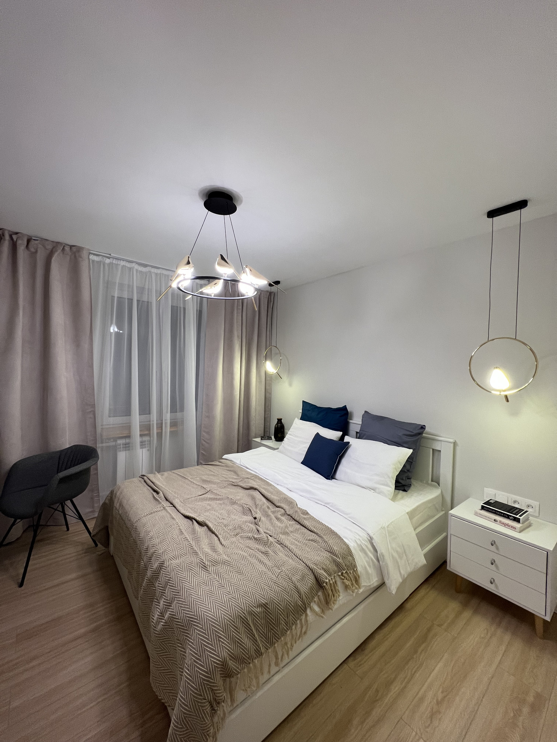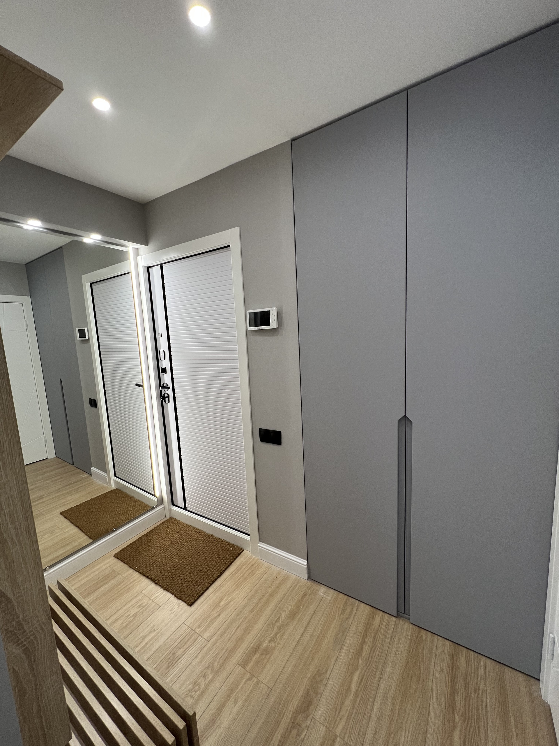 Ремонт сделан в эко-стиле – природные цвета и фактуры: трендовый почти белый цвет в спальне и гостиной; светло-серый в прихожей и холле в сочетании с деревянным половым покрытием придают уют и комфорт.