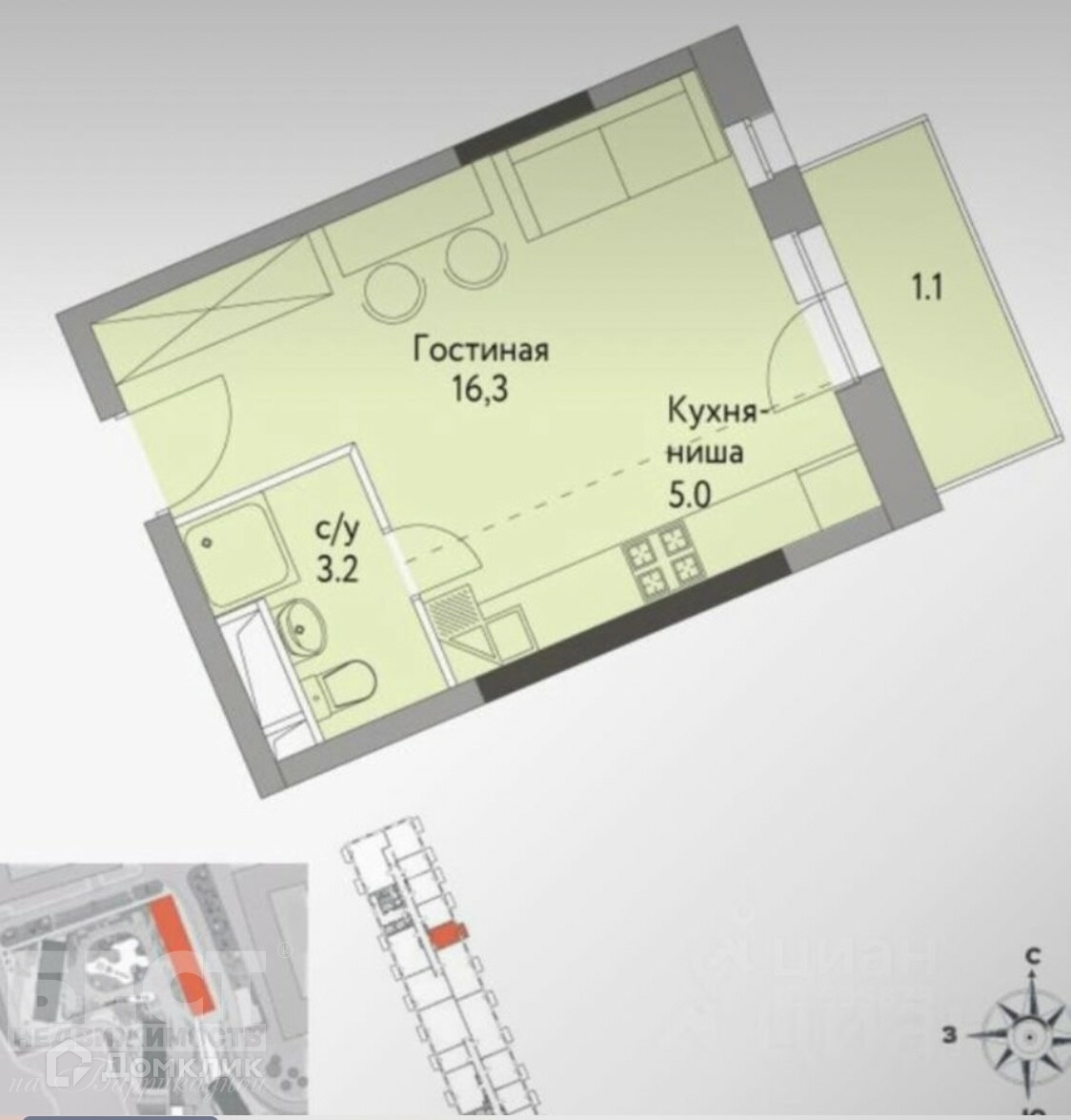 Жилая площадь 16.3 м2
