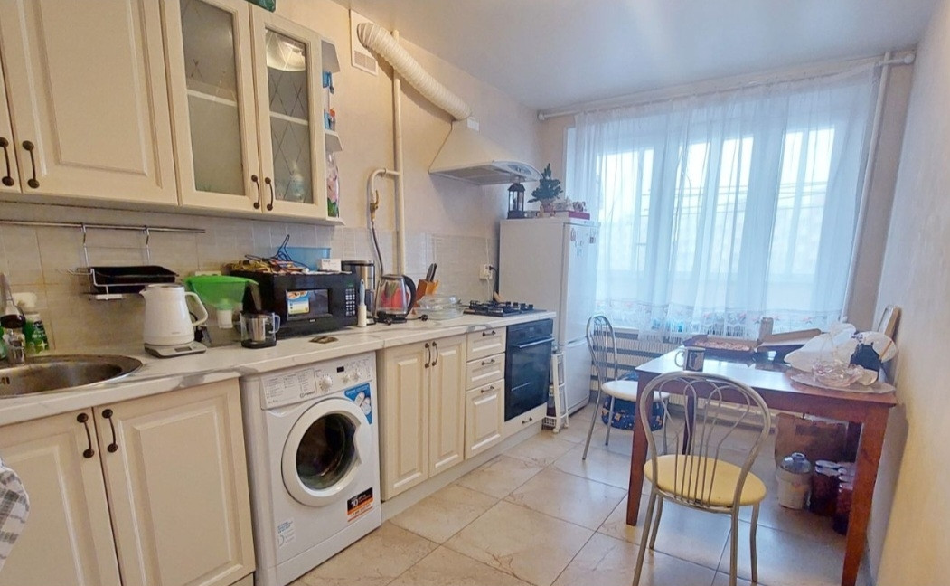 Большая кухня 10 кв, комната 19.4 кв, коридор и вместительный санузел.