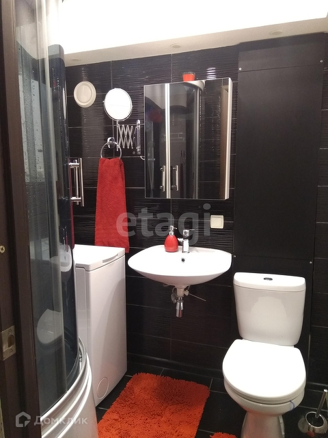 В ванной душевая кабина с глубоким поддоном и стиральная машина вертикальной загрузки.